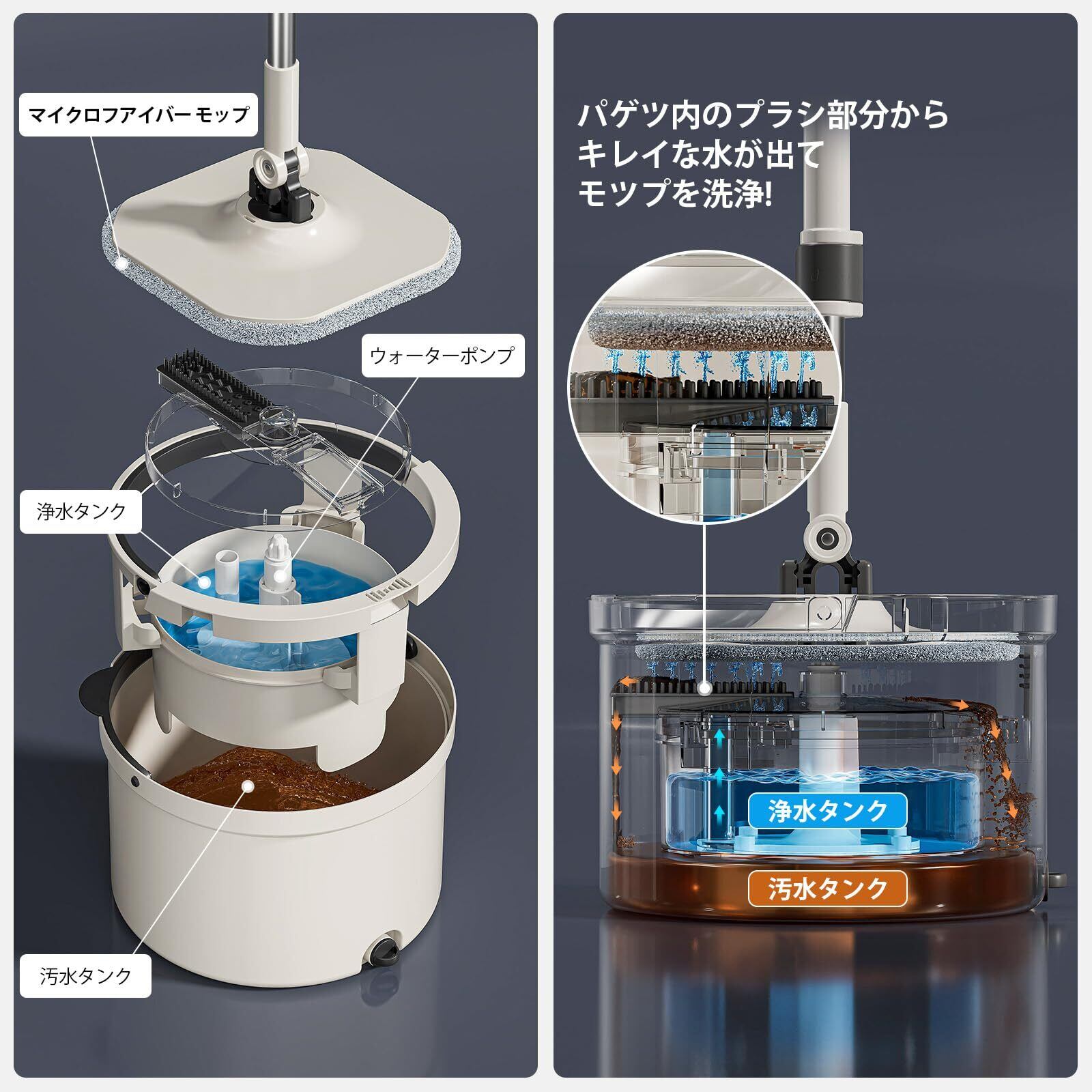 【汚水分離&大容量設計】 デュアルバケットで清潔な水と汚水を完全分離!1.9L大容量清水タンクにより、2LDKの広さを3回連続清掃可能。手を汚さずモップ洗浄・水切りが完了