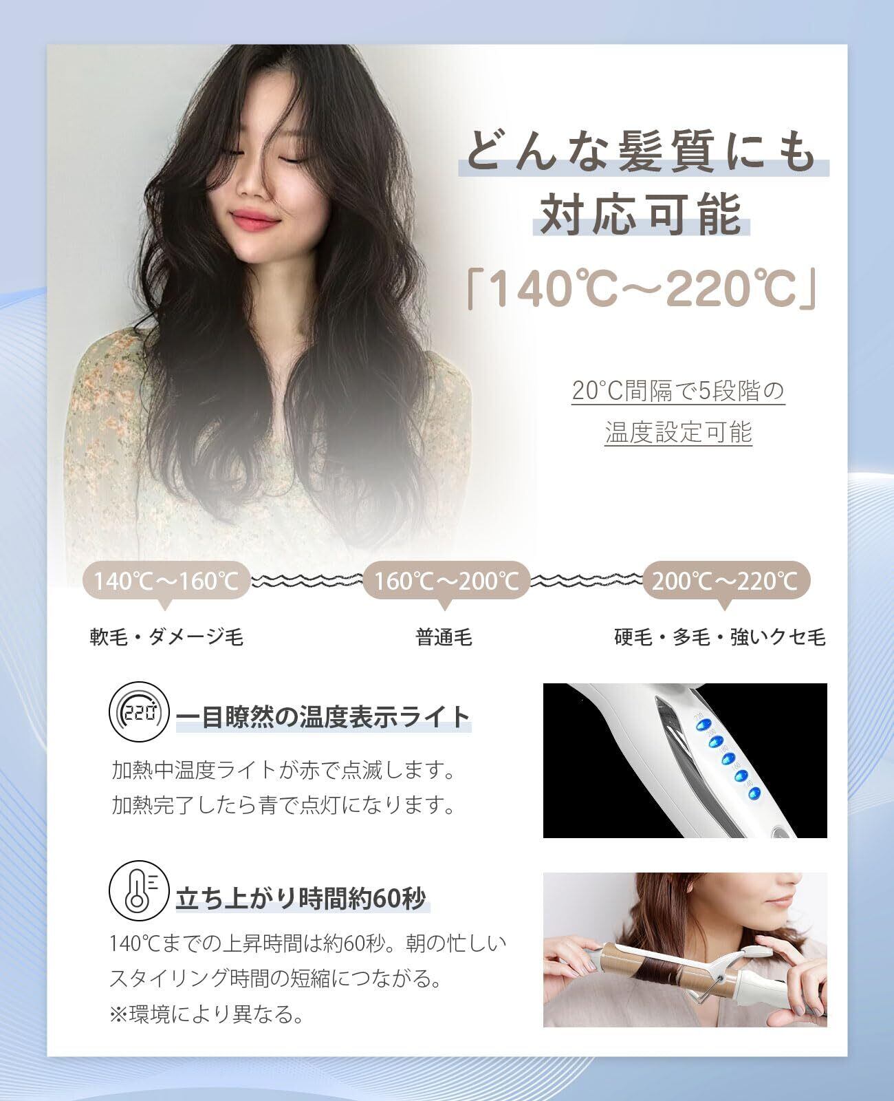 【140℃~220℃6段階の温度調節可能・全髪質対応】BAYATAシルクプロコテはMAX220℃のプロ仕様で、140℃~220℃まで、20℃ごとに6段階で温度調整が可能です。髪質やヘアスタイルに応じて最適な温度を調節できます。また、耐熱性が強いスタンドを搭載しており、熱が冷めるのを待つことなく置けるのが便利です。