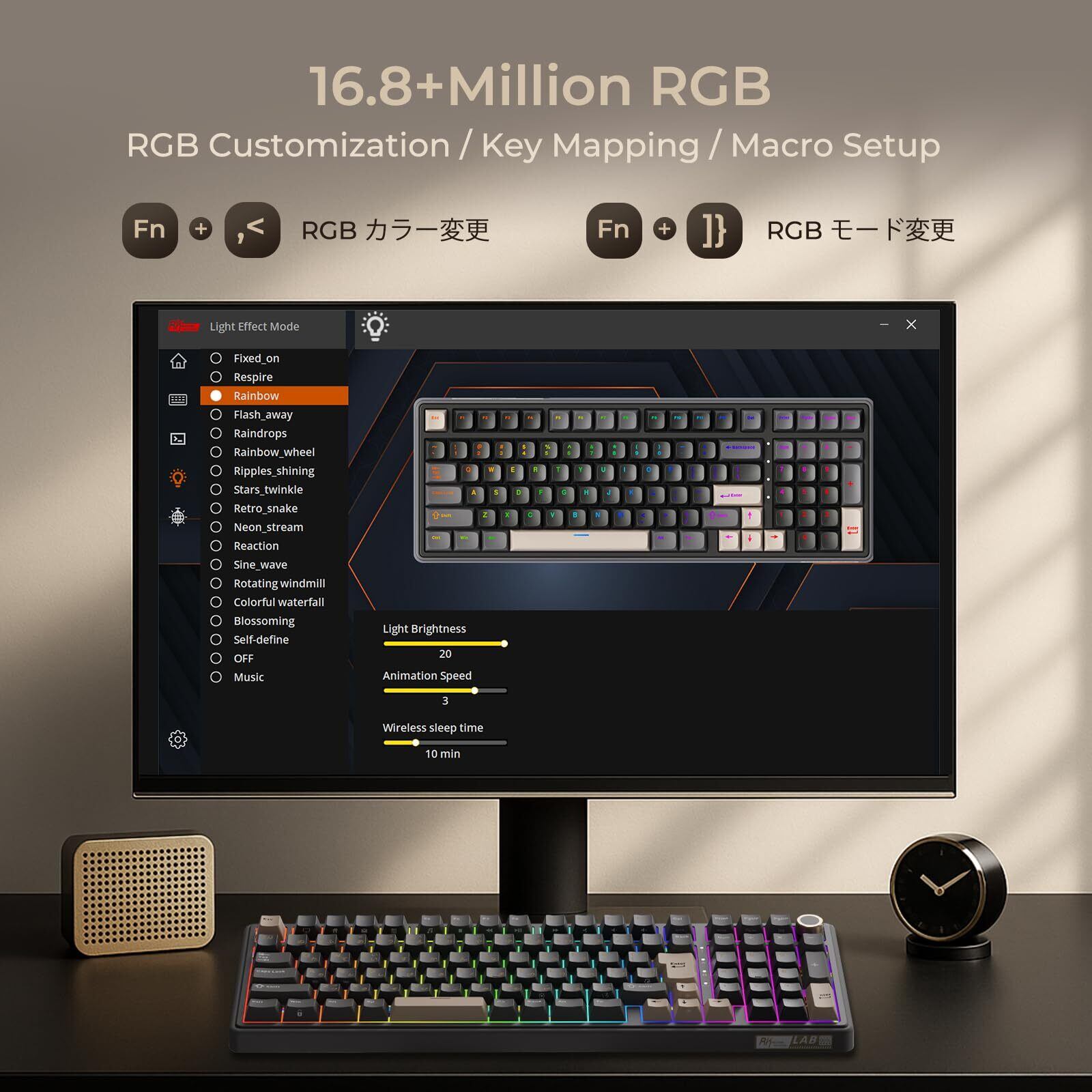 オンラインカスタマイズ対応のゲーミングキーボード: RK公式ドライバーでキー割り当て・マクロ設定・RGB調整を簡単に。Windows/Mac両対応の日本語配列フルサイズキーボードとして、パーソナライズが自由です