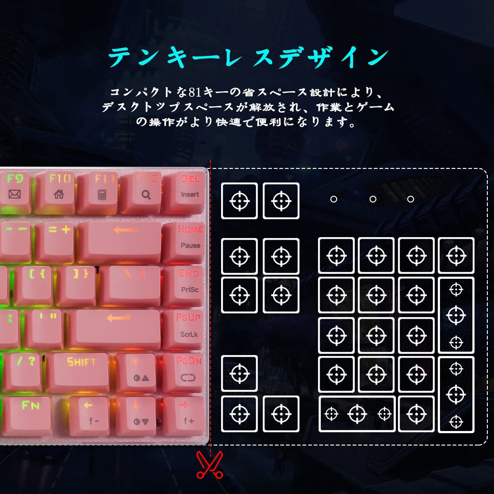 e元素ゲーミングキーボード メカニカル式キーボード 赤軸・青軸・茶軸 アンチゴースト英語配列81キー RGB発光LEDバックライト付き USB有線防水 Windows/Mac OS対応のオフィス&ゲーム用キーボード (青軸, ピンク) | Lulu