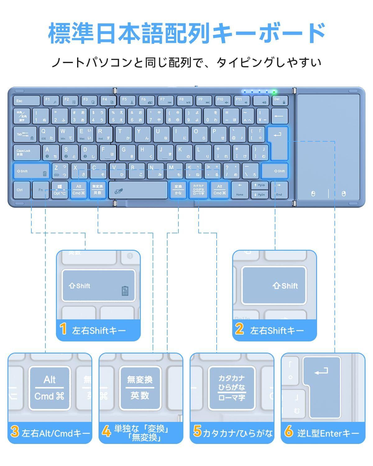【最新型】Omikamo キーボード bluetooth 折り畳み式 ワイヤレス JIS標準日本語配列 ipad キーボード スマホ マルチペアリング タッチパッド付き iOS/Windows/Android/Mac/Google対応 無線 コンパクト 軽量 薄型 ipad mini パンタグラフ 充電式(ブルー)