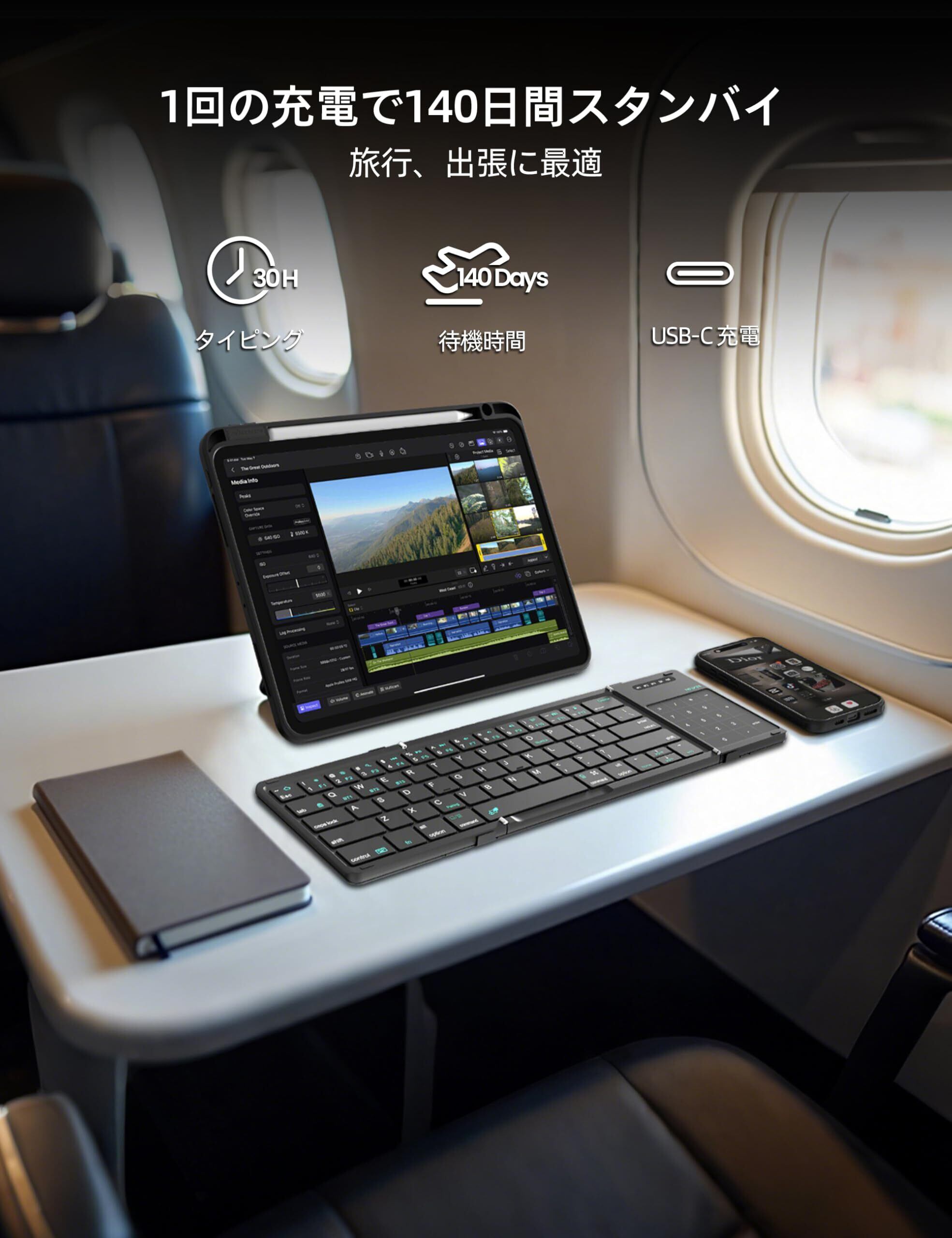 【超長時間スタンバイ・急速充電対応】140mAhバッテリーは、省電力設計により待機最大140日&連続30時間使用を実現。5V/2Aの高速充電に対応しており、わずか30分でフル充電可能です。モバイルキーボードとして日常使用にもビジネス用途にも対応し、旅行や外出先で安心して使えます。