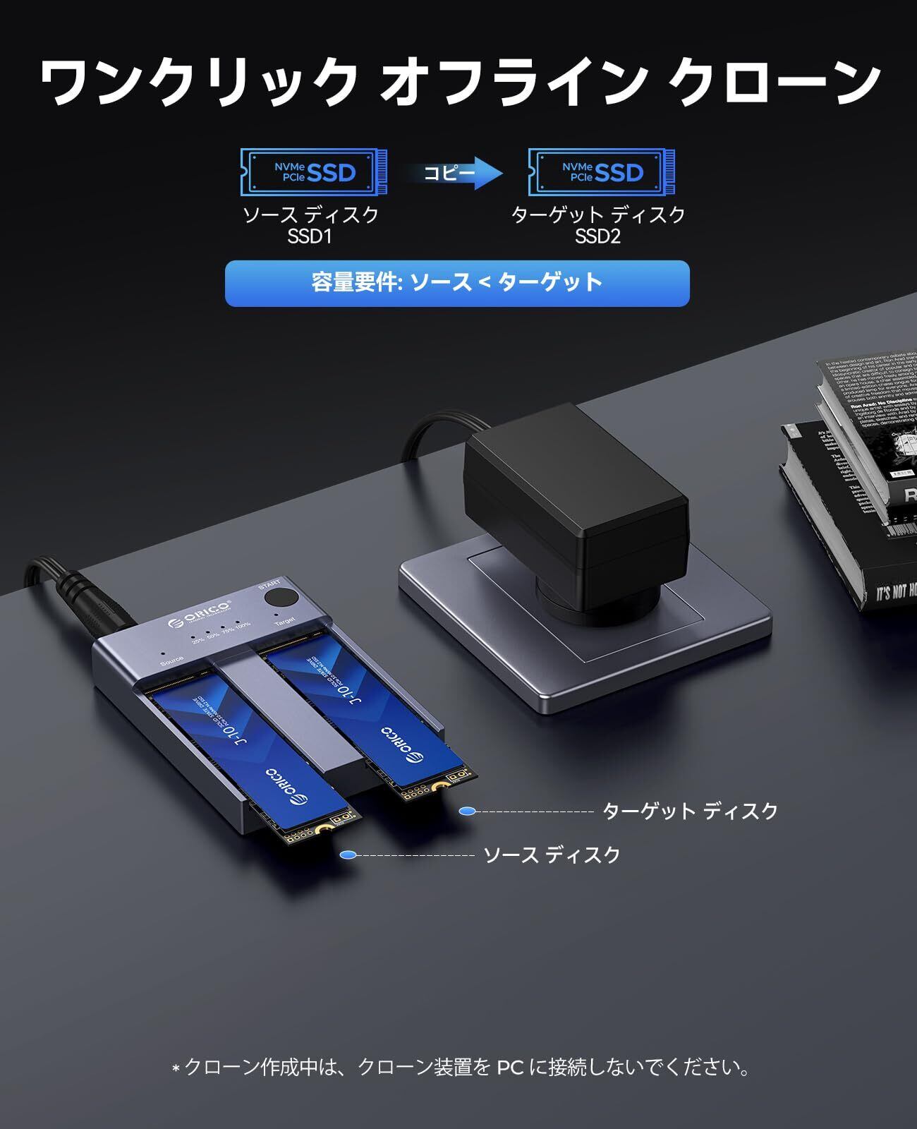 【クローン機能】ORICO USB-C NVME M.2 SSDケース 2ベイ コピー機能付 USB3.1 外付けケース M-Key / B&M Key(Nvmeのみ)に対応 USB 3.1 Gen2 10Gbps UASP 2230/2242/2260/2280 SSD対応 M.5 SSD 変換アダプタ エンクロージャ ケース グレー M2P2-C3-C