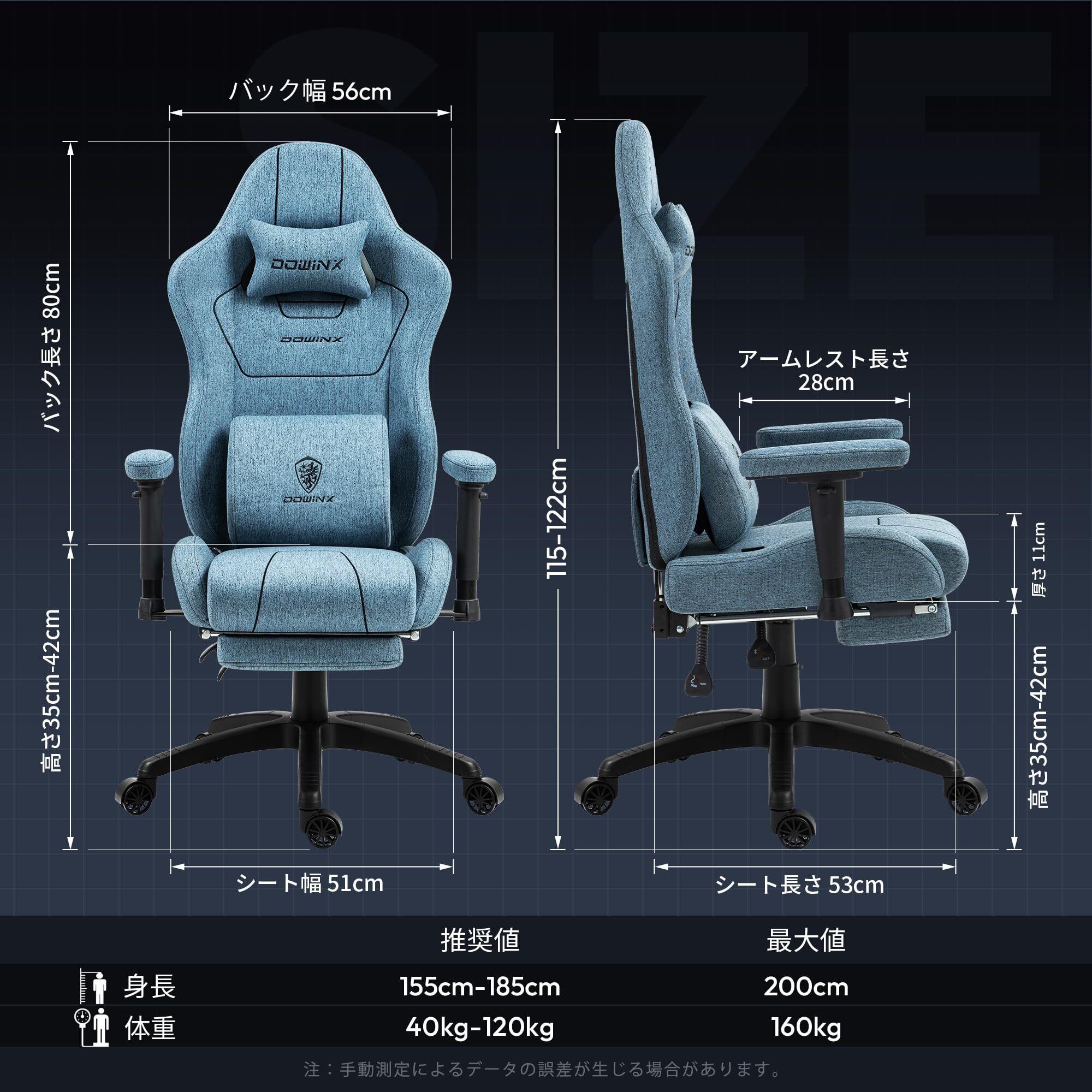 Dowinx ゲーミングチェア ファブリック オフィスチェア デスクチェア 椅子 テレワーク 疲れない チェア イス いす ワークチェアpcチェア パソコンチェア 幅広座面 通気性 布生地 高反発 140°リクライニング ポケットコイルクッション ソファの座り心地 お尻に優しい ブルー LS-6657BC05
