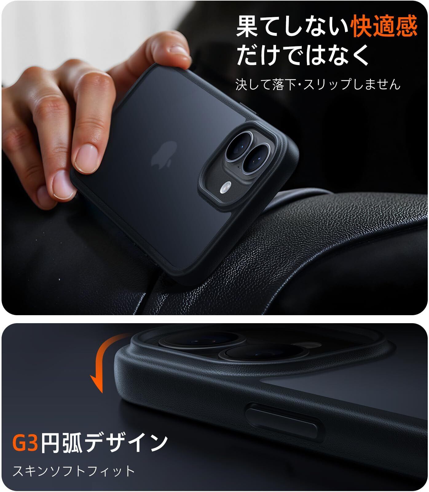 【滑り止め・肌に馴染む握り心地】側面はTPUとTPEの黄金比率で、防滑性と柔らかさを両立している。側面の防滑デザインにより、どんな持ち方でも手から滑り落ちない安心感がいっぱいである。ケースの縁にはG3(人間工学に基づいたエッジの曲線設計で、握り心地が大幅に向上)ラウンド加工を採用。流線型の美しさを演出すると同時に、握ったときの快適さを大幅に向上させる。表面にはレーザー加工のナッパ調テクスチャーを施し、驚くほどの肌触りでグリップ感を大幅アップする。ナッパ風テクスチャーは、肌に優しい滑らかな手触りを与えるだけでなく、ケース全体の質感をワンランク上へさせる。光の加減で浮かび上がる繊細な模様が、細部へのこだわりを物語る。For iPhone 17 ケース