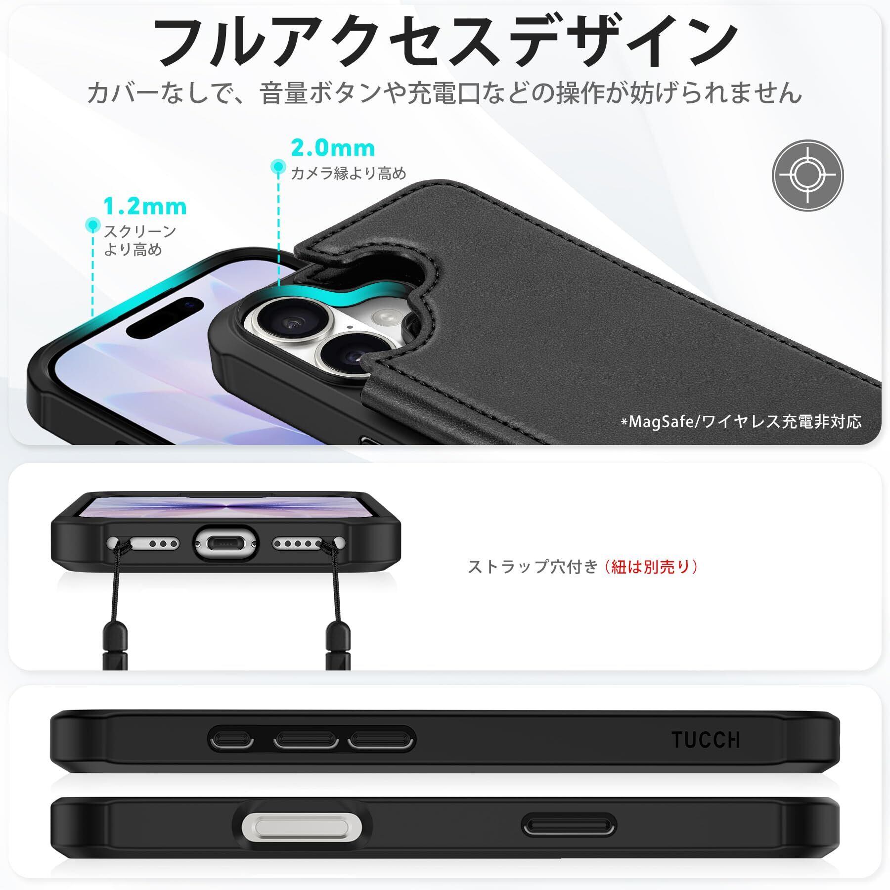 TUCCH iPhone17 対応 ケース ショルダーストラップ付き 背面カード収納 6.3インチ PUレザー RFIDブロッキング 3つカードポケット ストラップホール付き 取り外し不可 TPU素材 滑り止め 衝撃吸収 マグネット開閉 アイフォン17 対応 携帯カバー 2025年発売 5G ブラック