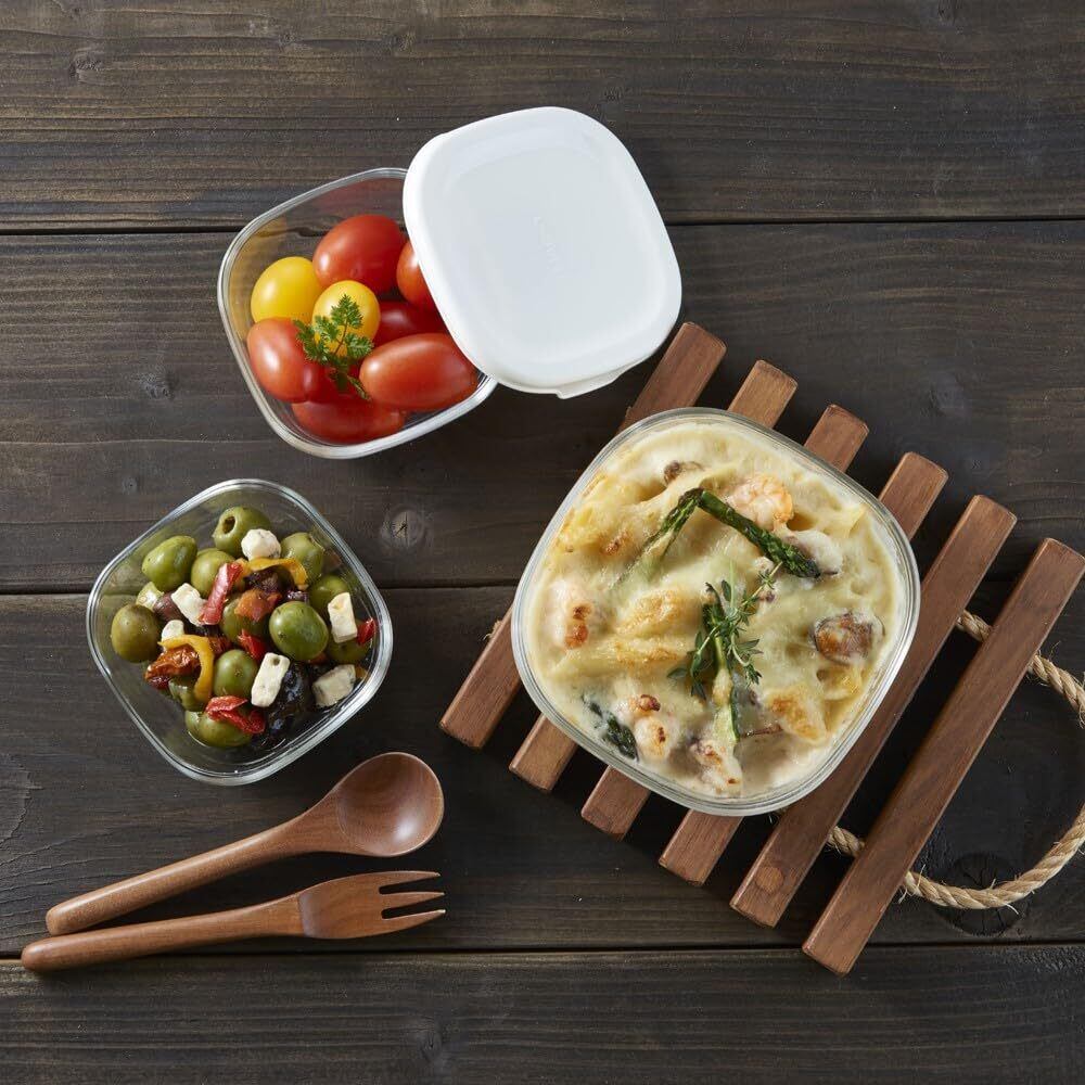 オーブン調理もできる耐熱ガラス製角型保存容器。(オーブン使用時はフタを外す)