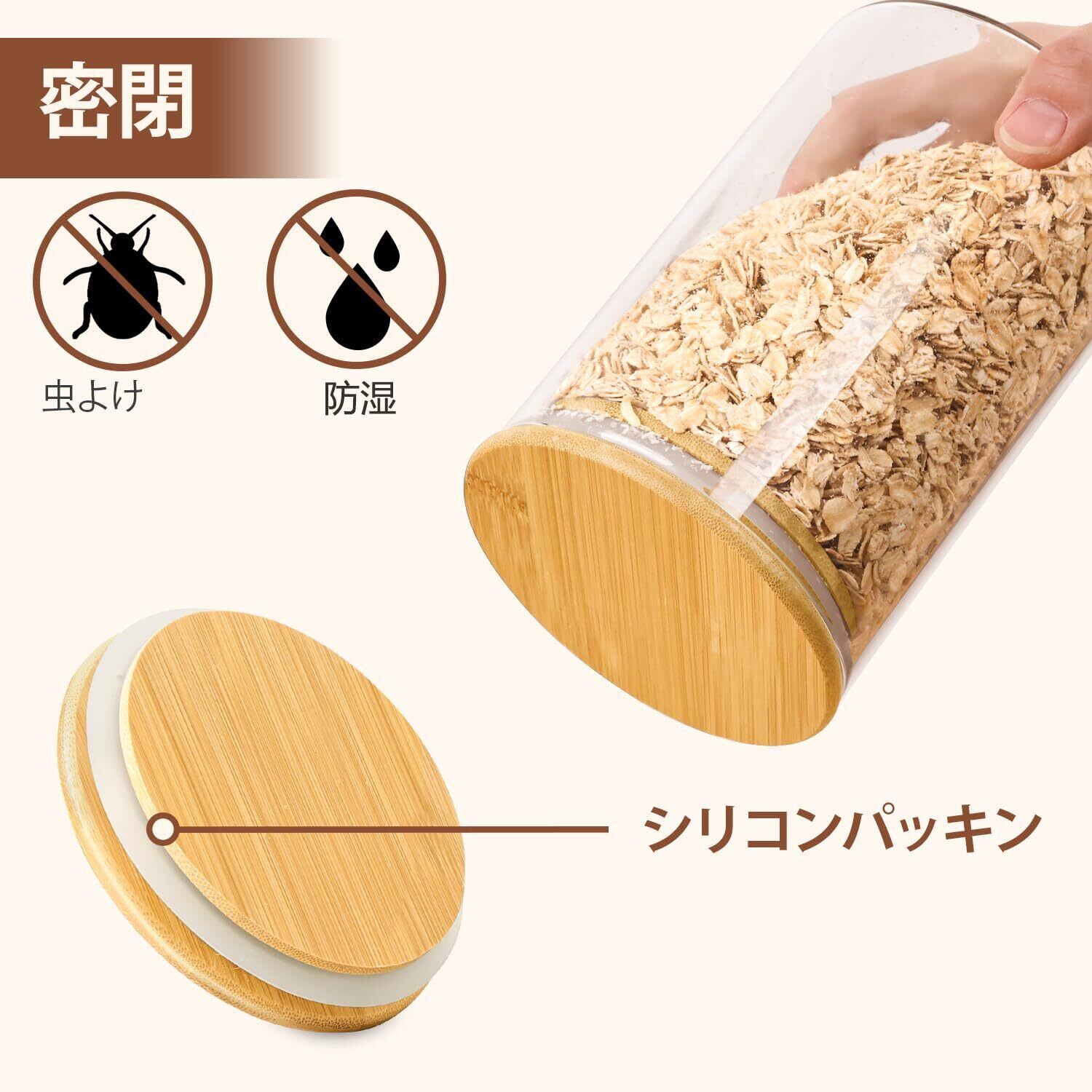 「密閉性よい」このガラス保存容器は、ナチュラルの竹蓋とシリコンパッキンを使用して密閉容器としての機能を高め、食品が湿気から守られ、鮮度を長く保つことができます。