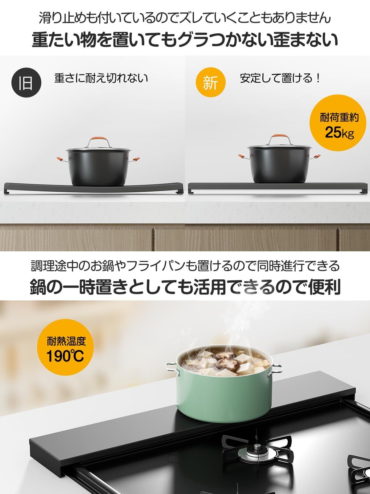 「調味料やお鍋の一時置きに」調理中の置き場に困る鍋などの一時置きスペースとしても使えます。今まで使えてなかった排気口周りやコンロ奥のデッドスペースを有効活用することで、収納スペースが広がるだけでなく、作業効率もアップします。よく使う調味料や、お料理中のフライパンやお鍋の一時置きにも便利です。