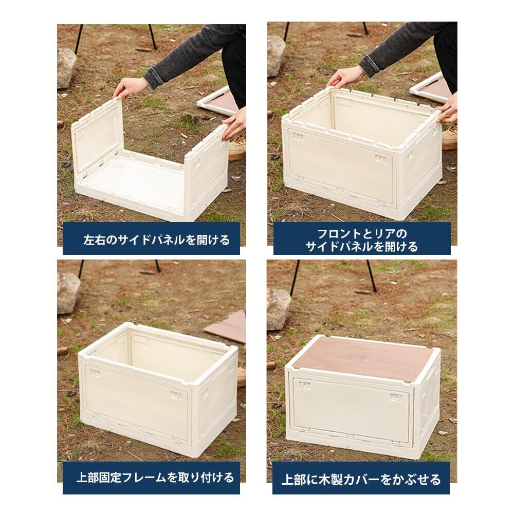 【実用的な木製の蓋】厚みのある木目調の天板は自由に取り外しでき、テーブルや椅子としても使えます。キャンプなどアウトドアでも便利です。収納箱の両端には凹みがあり、満杯でも簡単に運べて、持ち運びが楽です。洗練されたデザインで、コンパクトかつ運びやすく、安定した構造で、滑りにくい耐摩耗性のある滑らかな表面です。無臭で安心して使えます。