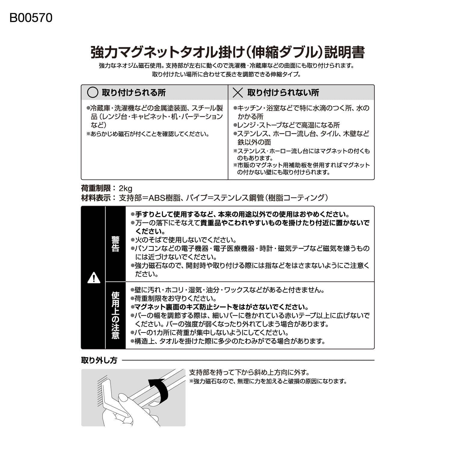 強力 マグネット 伸縮 タオル掛け 伸縮幅 34.5~60.5cm(干幅29~54.5cm) 耐荷重2kg 曲面取付け対応 キズ防止シート付き ホワイト
