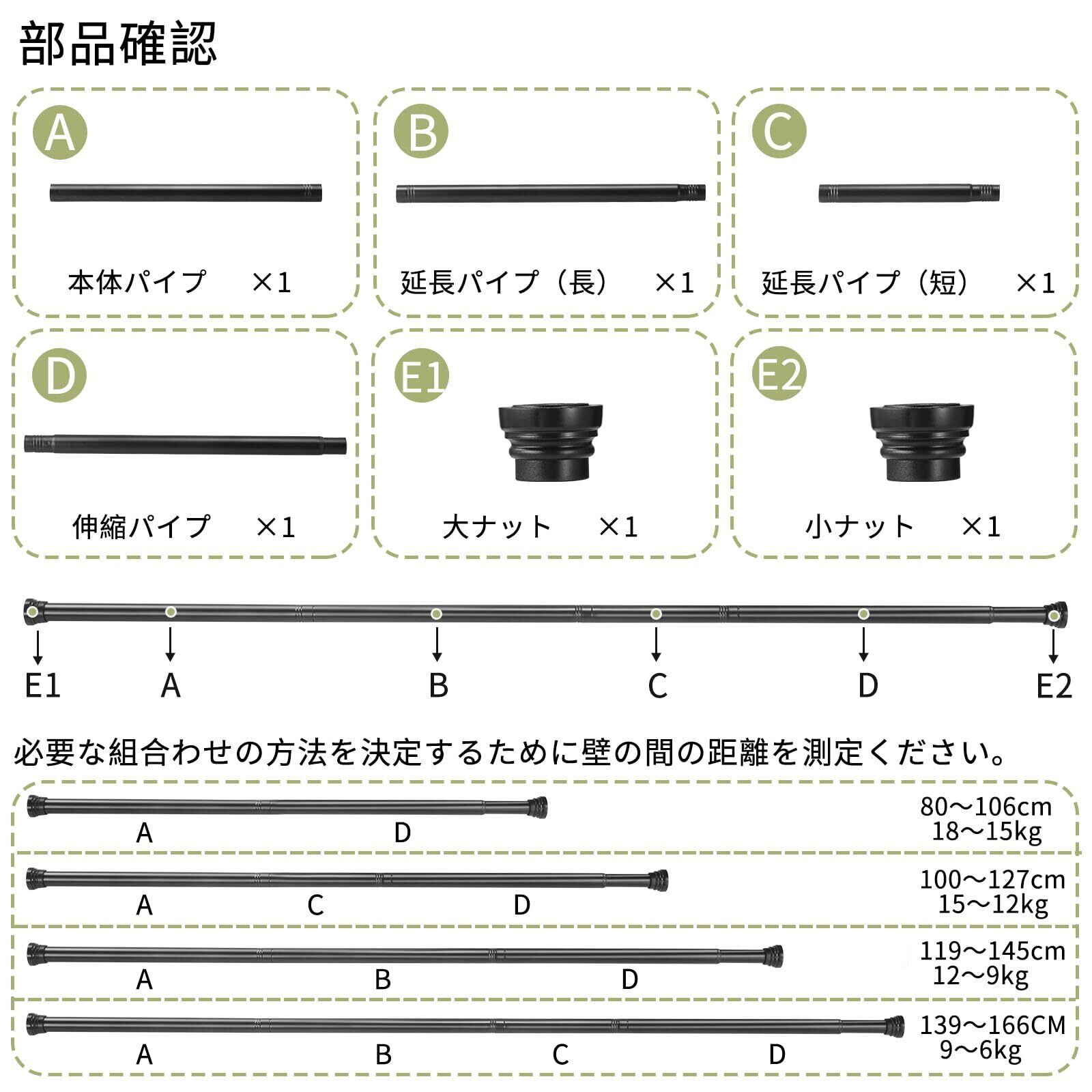 耐荷重拔群:使用する長さによって耐荷重も違いです、長さが短いほど耐荷重が強くなります。80cm~166cmは18kg~6kgを対応できます。