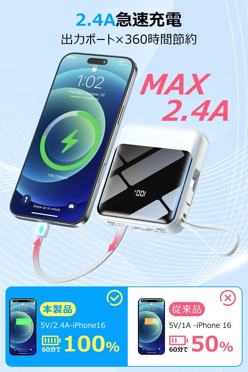 【2025業界新設計モバイルバッテリー!優れた実用性】外出するために設計された超軽量モバイルバッテリーが登場し、さまざまな煩わしい充電線を持ち込む必要がなく、モバイルバッテリーの内蔵ケーブルは出力と入力の需要を実現することができます。4本内蔵ケーブルで各種機器の充電も可能です。更に2個USB出力口付きで、最大5台の設備を同時に充電することもでき、友達家族と一緒にいるときは、必要に応じてみんなで充電することができます。携帯性を重視する方には、ケーブル内蔵型のモバイルバッテリーがおすすめです。外出する際の荷物が減らせるほか、自宅や訪問先にケーブルを置き忘れる心配がありません。必要なときに素早く引き出して充電できます。
