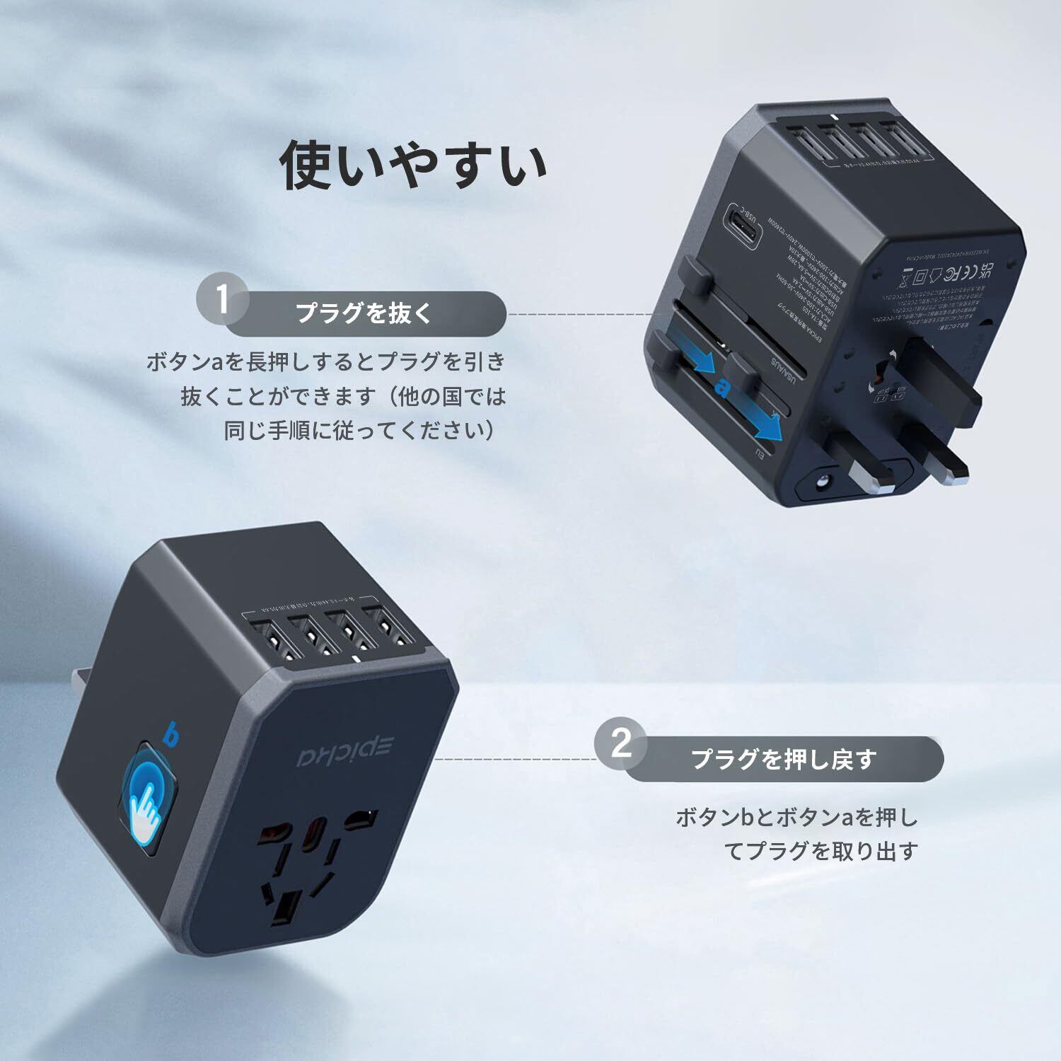 EPICKA 海外 変換プラグ 全世界対応 C/BF/O/Aタイプ マルチ変換プラグ 1つUSB-Cと4つUSB-Aポート付き ヨーロッパ/韓国/オーストラリア/イギリス/アメリカ/中国などの国に対応海外旅行用コンセント(ブラック) | Lulu