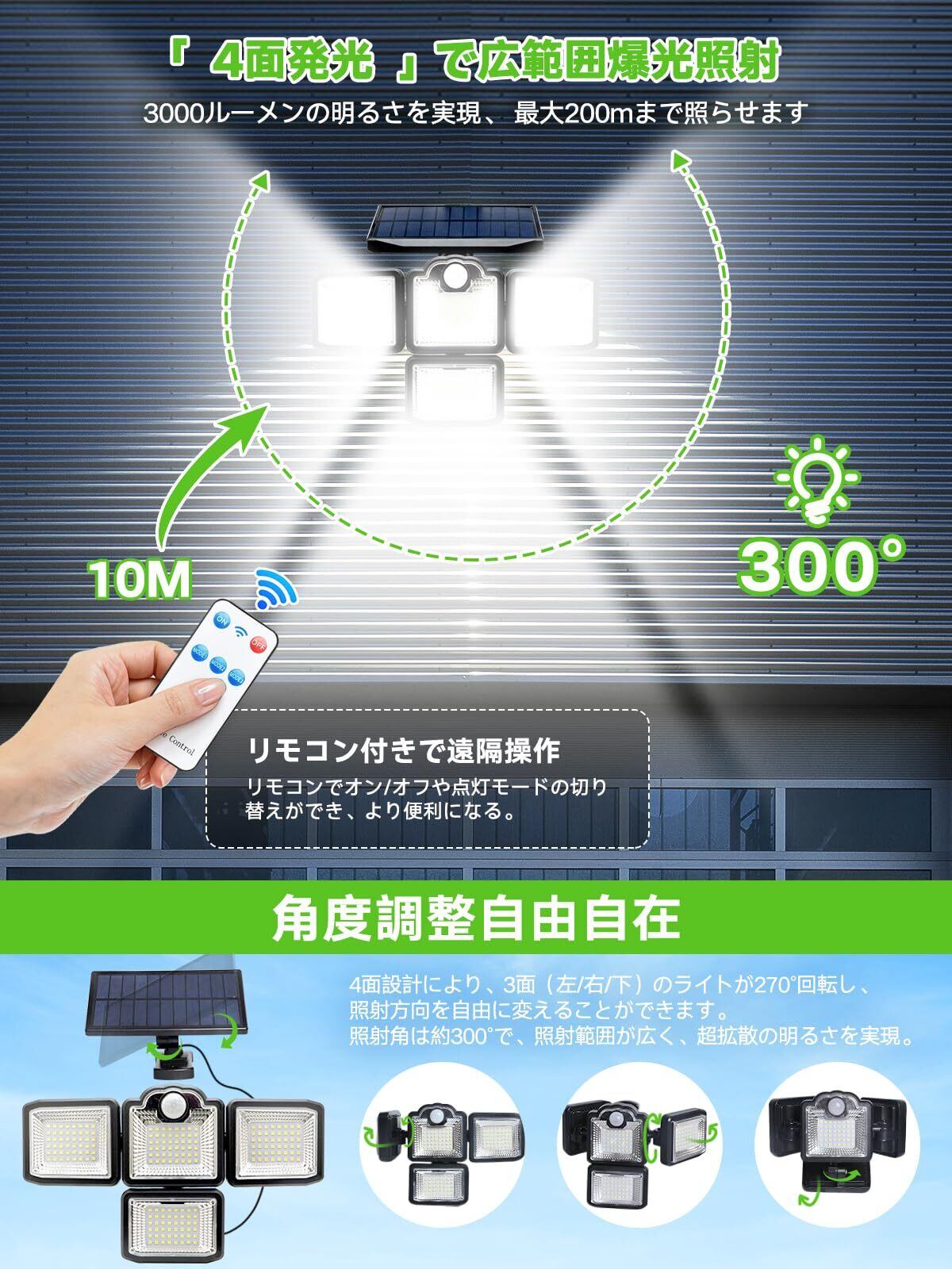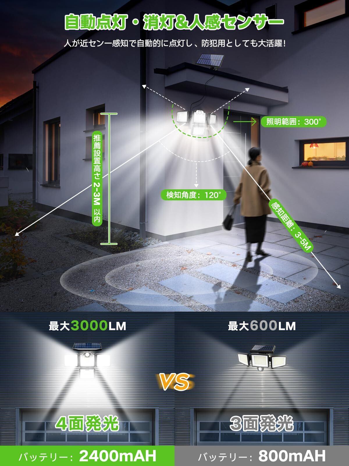 【4面発光調整可能・高輝度LED3000ルーメン】弊社のこのセンサーライトは7000K超高輝度LEDチップを搭載し、3000ルーメン輝度を提供しています。左右両側と下側のライトは自分で角度を調節することができ、360度回転できるので、お好みに合わせて自由に照射方向を変えることができます。照射角度は約300°で、より広い範囲を照らします。