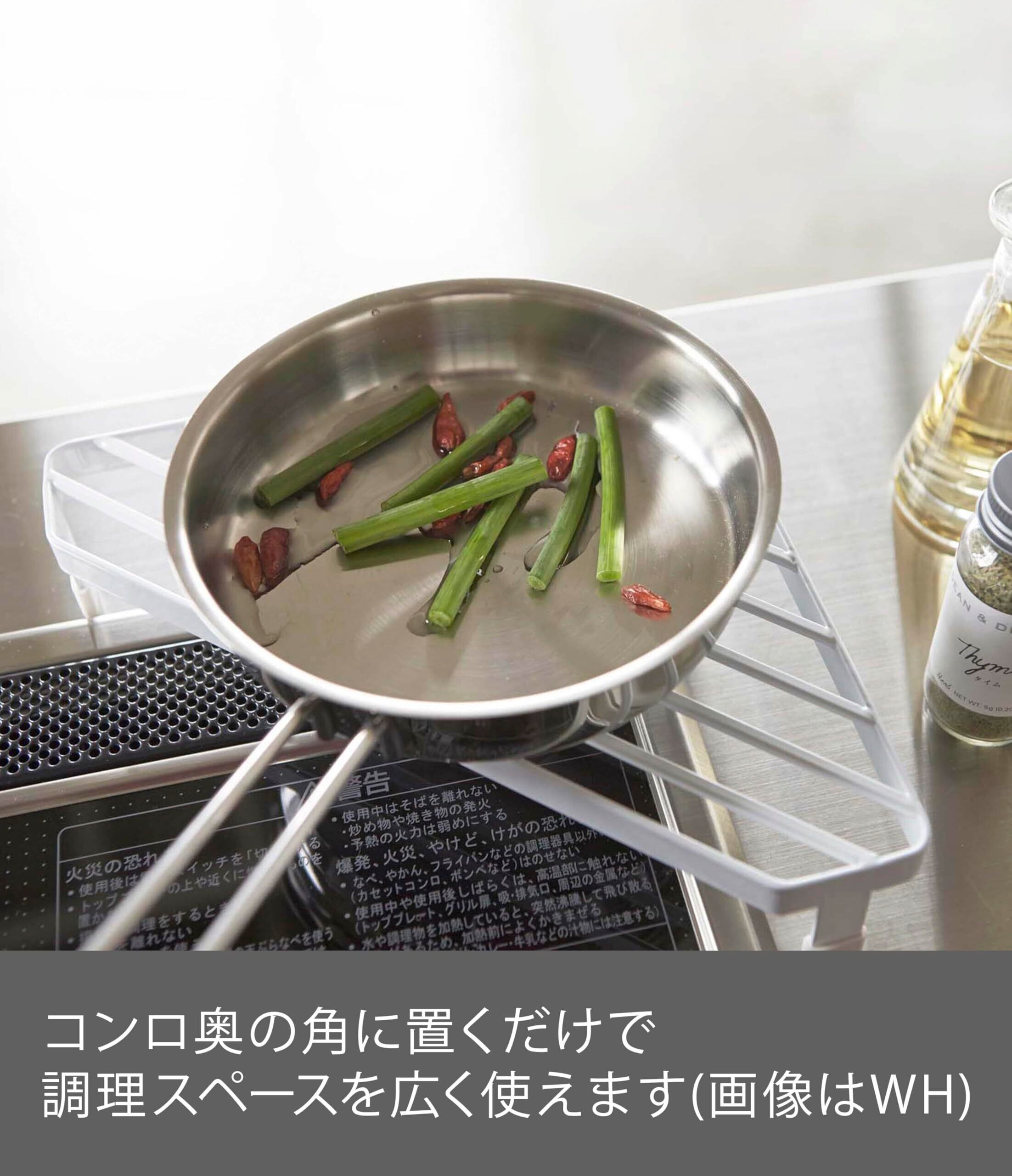 調理中のフライパンや小鍋の一時置きに便利! コンロの角に置いて調理スペースを広く使えます。