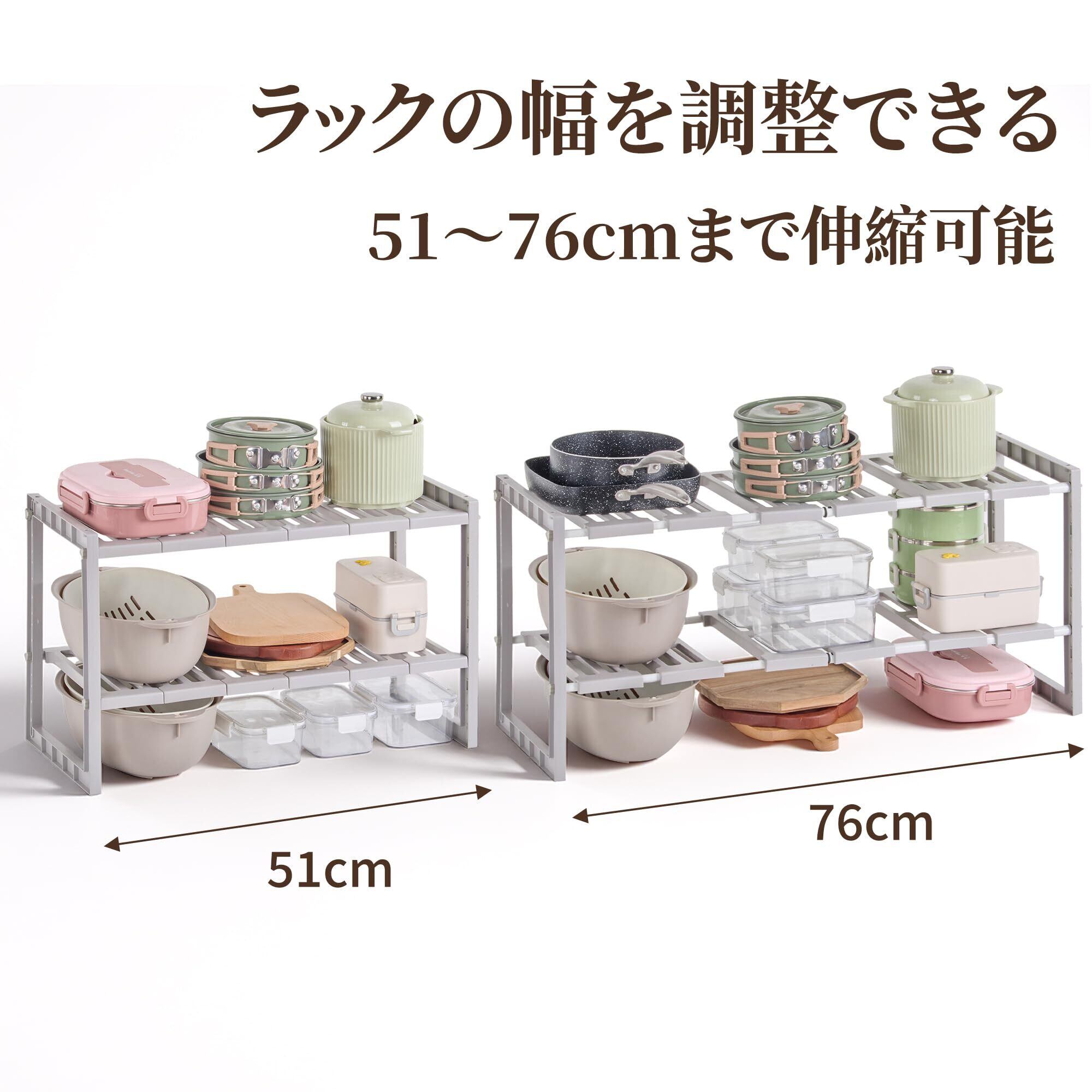 VECELO シンク下 収納 ラック 調整可能 【伸縮式&収納力UP!】幅51-76cm×奥30cm×高さ41cm 2段 簡単組立 食器 伸縮棚 キッチン 台所 鍋 洗面台下 洗面台 押入れ 流し台 整理棚 高炭素鋼 シルバー | Lulu