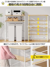 【5段階高さ調整可能な可動棚】 収納物に合わせ、棚の高さを13cmピッチで5段階調節できます。棚板はフック式のため、サイドバーに掛けるだけで、工具は不要です。下部スペースにダストボックスを置いたり、中棚を外して小型冷蔵庫の上に設置したりしてもOKです。デッドスペースを効率的に活用できます。■高さのある大型電子レンジにも対応するキッチン棚です。