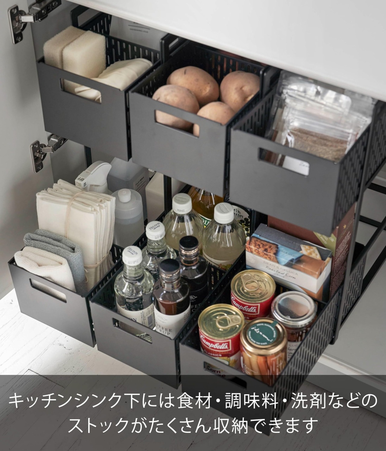 扉タイプのシンク下空間を有効活用!スライド式のバスケット2段タイプ。