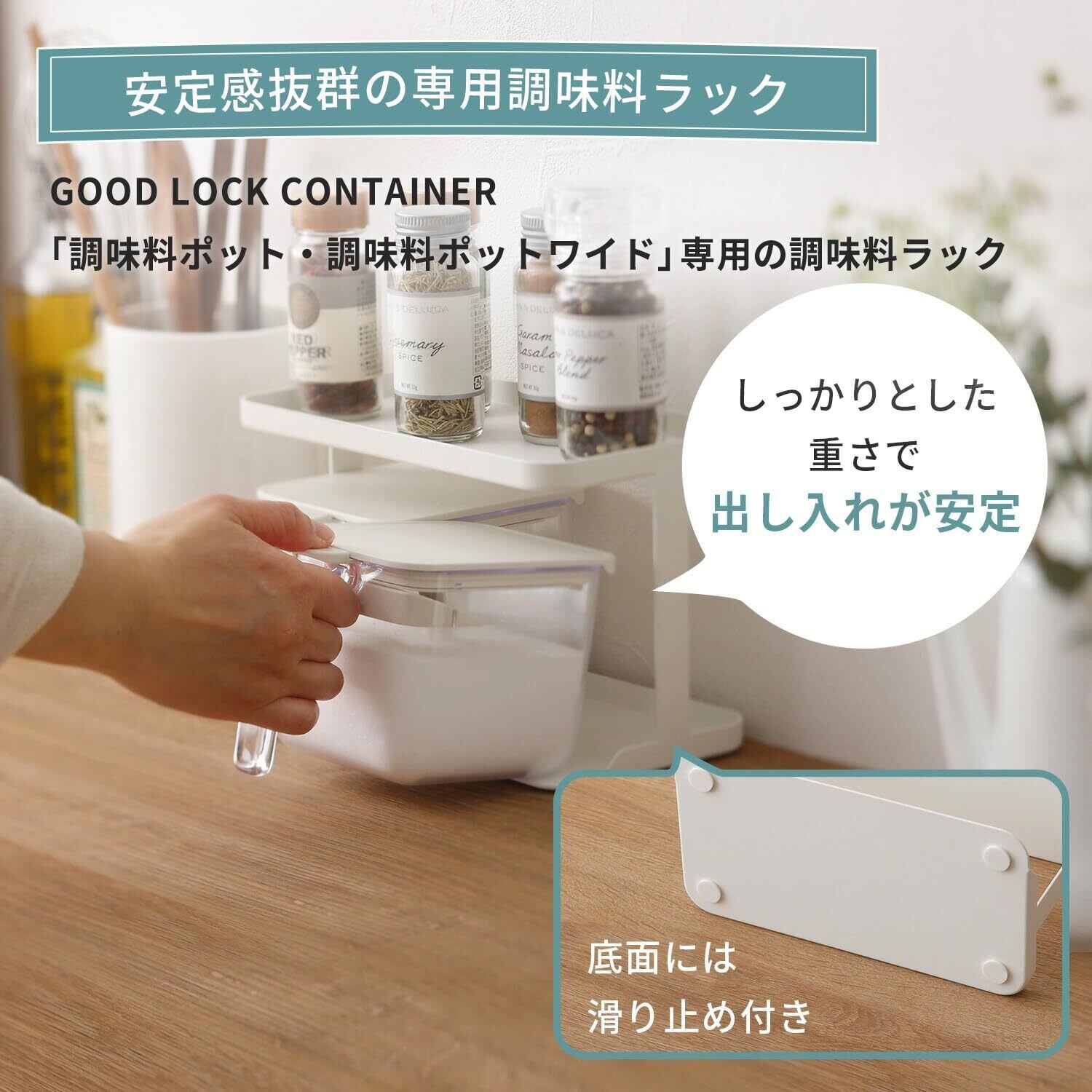 【調味料ポット専用ラック】パッキンでしっかり閉まって湿気を防ぎ、ワンタッチで開く「GOOD LOCK CONTAINER( グッドロックコンテナ)」調味料ポットの専用ラック。