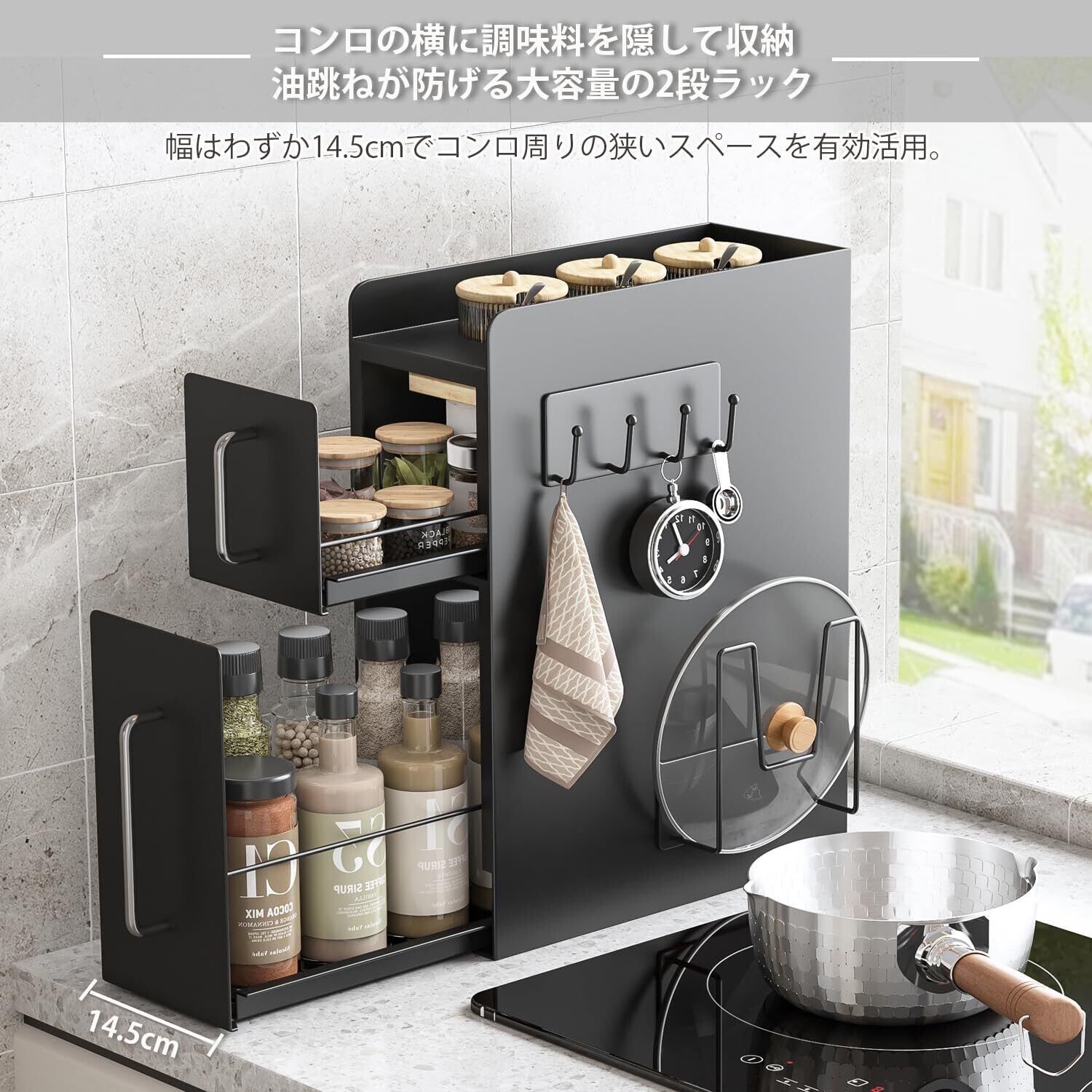 【隠せる調味料ラック】隠せる調味料ラックはスパイスの小瓶からお醤油や油類などを巧妙に隠して収納することができ、調味料ボトルを油跳ねから守り、コンロ回りを清潔に保ちます。奥行僅か14.5cmのスリムデザインは、コンロ横に設置すれば、空いたスペースを有効活用し、調味料が手頃で取り出しに便利です。