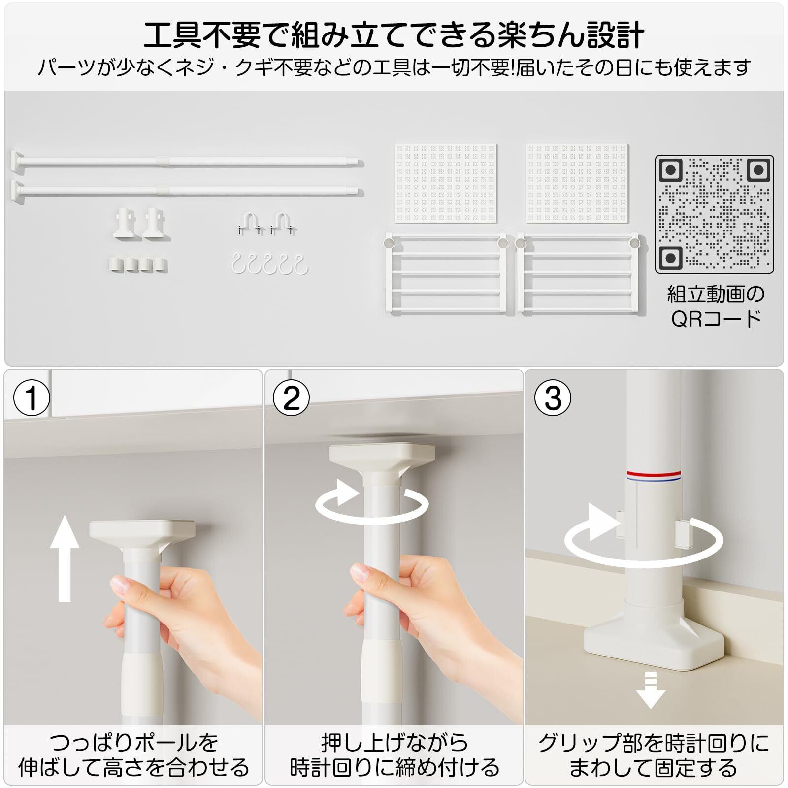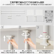 特徴 69-110cmで調節可・棚板無段階調整・天板3分割/着脱式階層シェルフ・段差対応・転倒防止ベルト付・穴あけなく壁を傷つけない・ポールの上下に滑り止めゴム付・耐荷重20kg・S字フック5個付・防錆加工