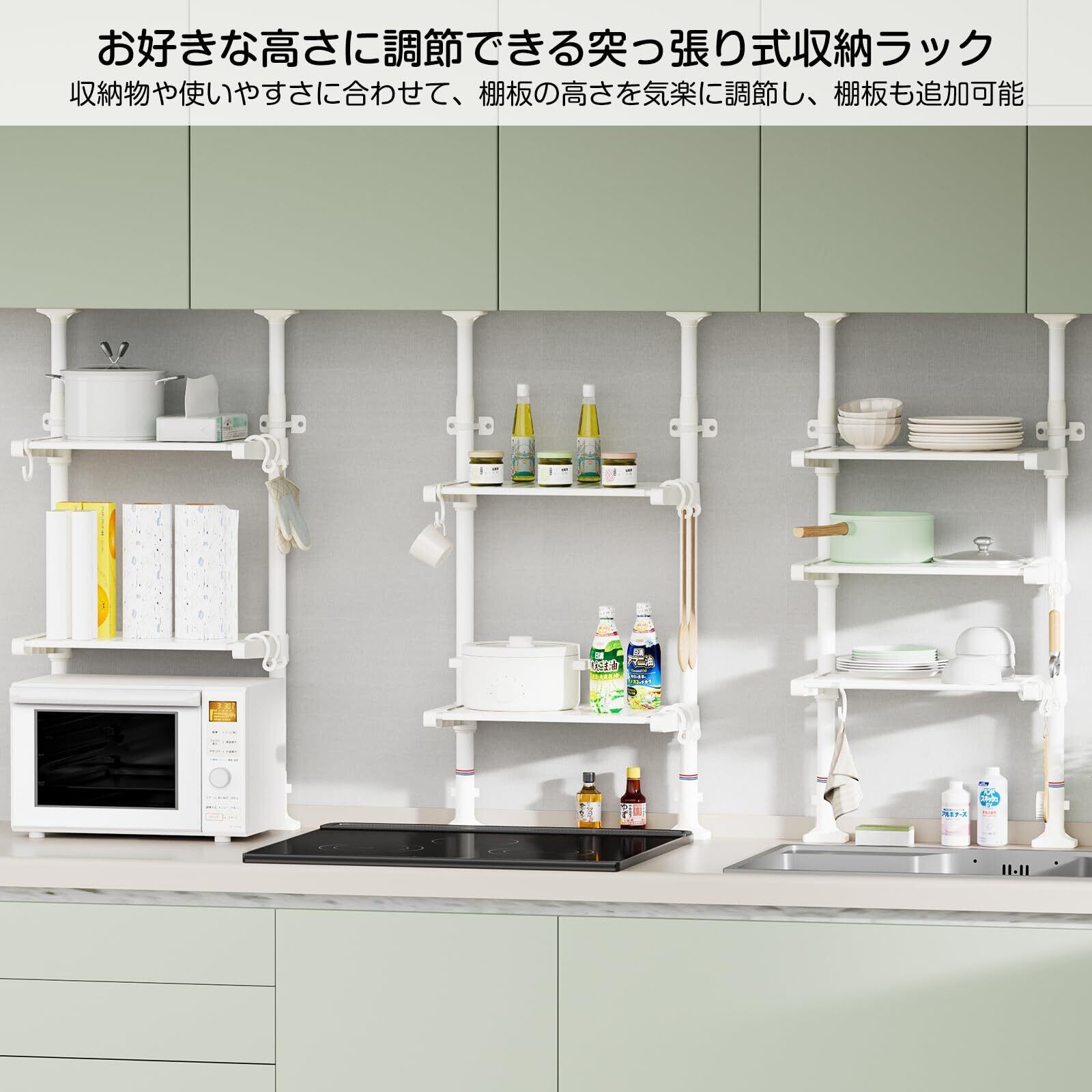 ✿【棚/ラック両用・棚板固定簡単・追加可能】このキッチンつっぱり棚 ラックは棚板の固定が簡単で、収納物に合わせて棚板の高さを手軽に変えられます。必要に応じて棚板を追加したり、多台を組み合わせて連結することも可能。棚板は取り外し式で、棚としてだけでなくラックとしても活用できる柔軟な設計です。キッチンをはじめ、あらゆる場所で自分らしく活用できるキッチン調味料ラックです。