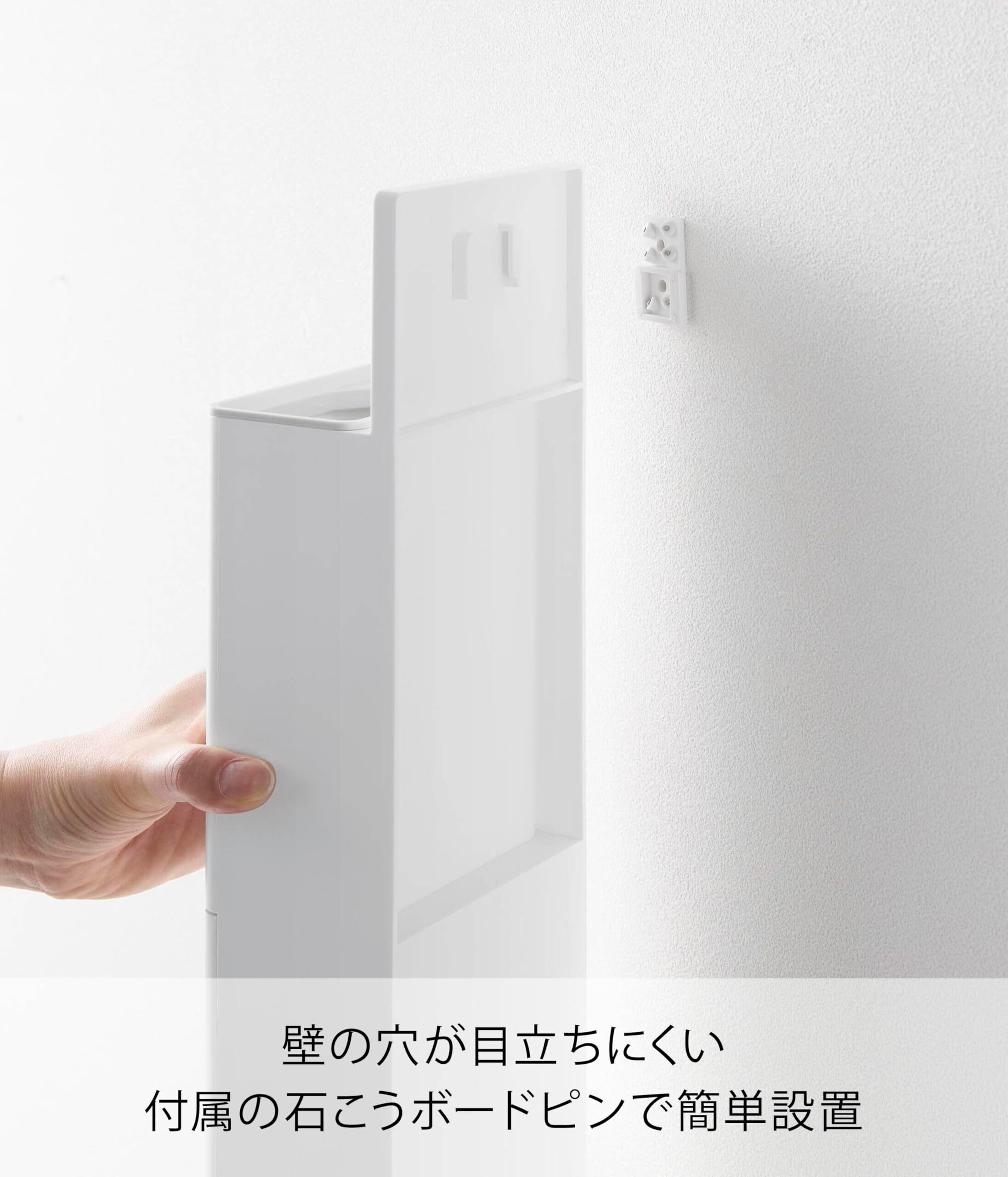 石こうボードピンで壁面に設置できる流せるトイレブラシのハンドルと替えブラシが収納できるホルダーです。お好みの場所に浮かせて設置できるので床のお掃除もスムーズに行えます。奥行がスリムな形状なので限られたトイレ空間もスッキリ。蓋の向きを変えることができるのでハンドルは左右どちら側でも収納が可能で、替えブラシもまとめて収納することができます。壁の穴が目立ちにくい石こうボードピンで簡単設置。