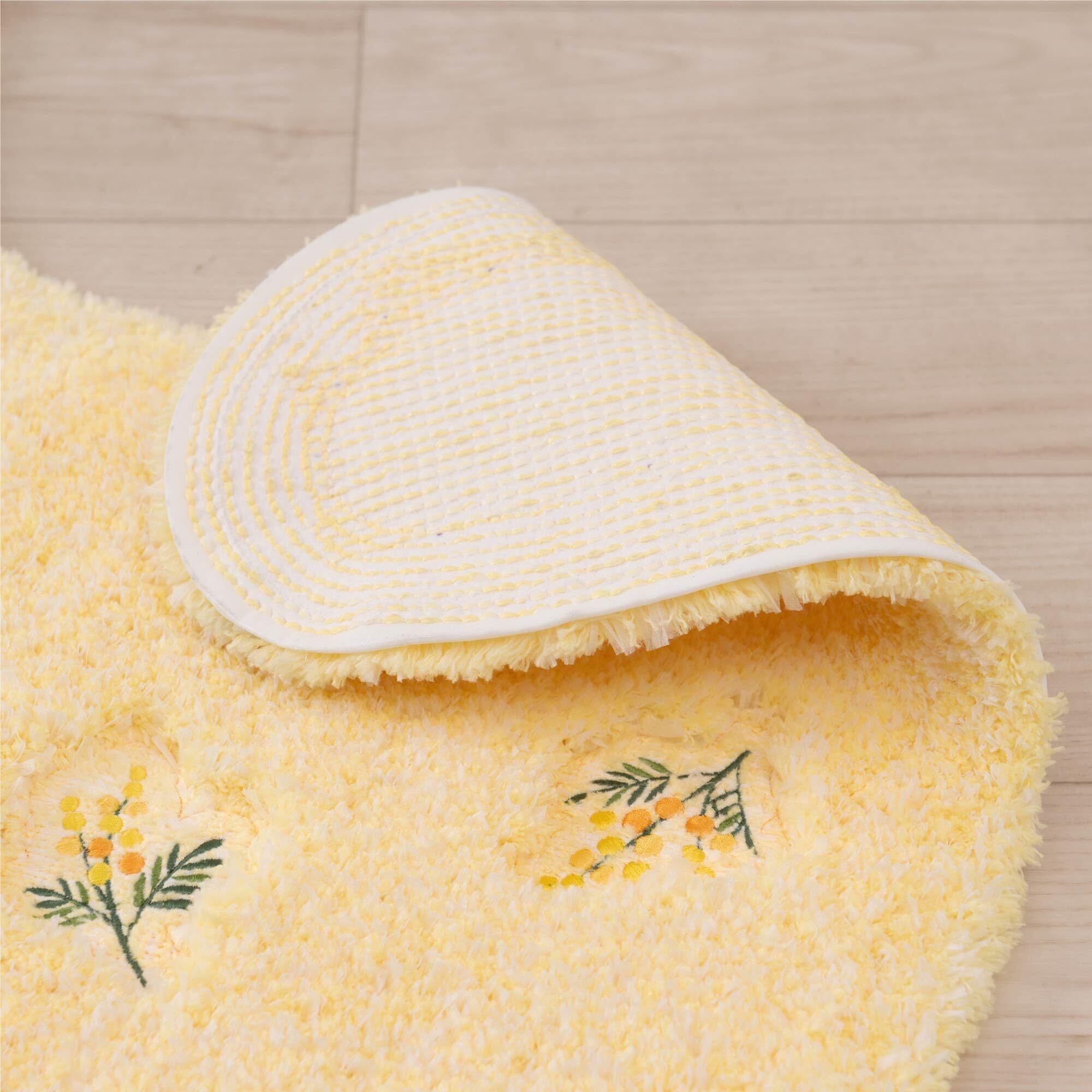 ポリエステル糸とポリエステルのスリット糸をミックスしたボリュームあるベースにミモザの花刺繍を散りばめました。ふんわり優しいイエローカラーが愛らしい、ロングサイズのトイレマットです。
