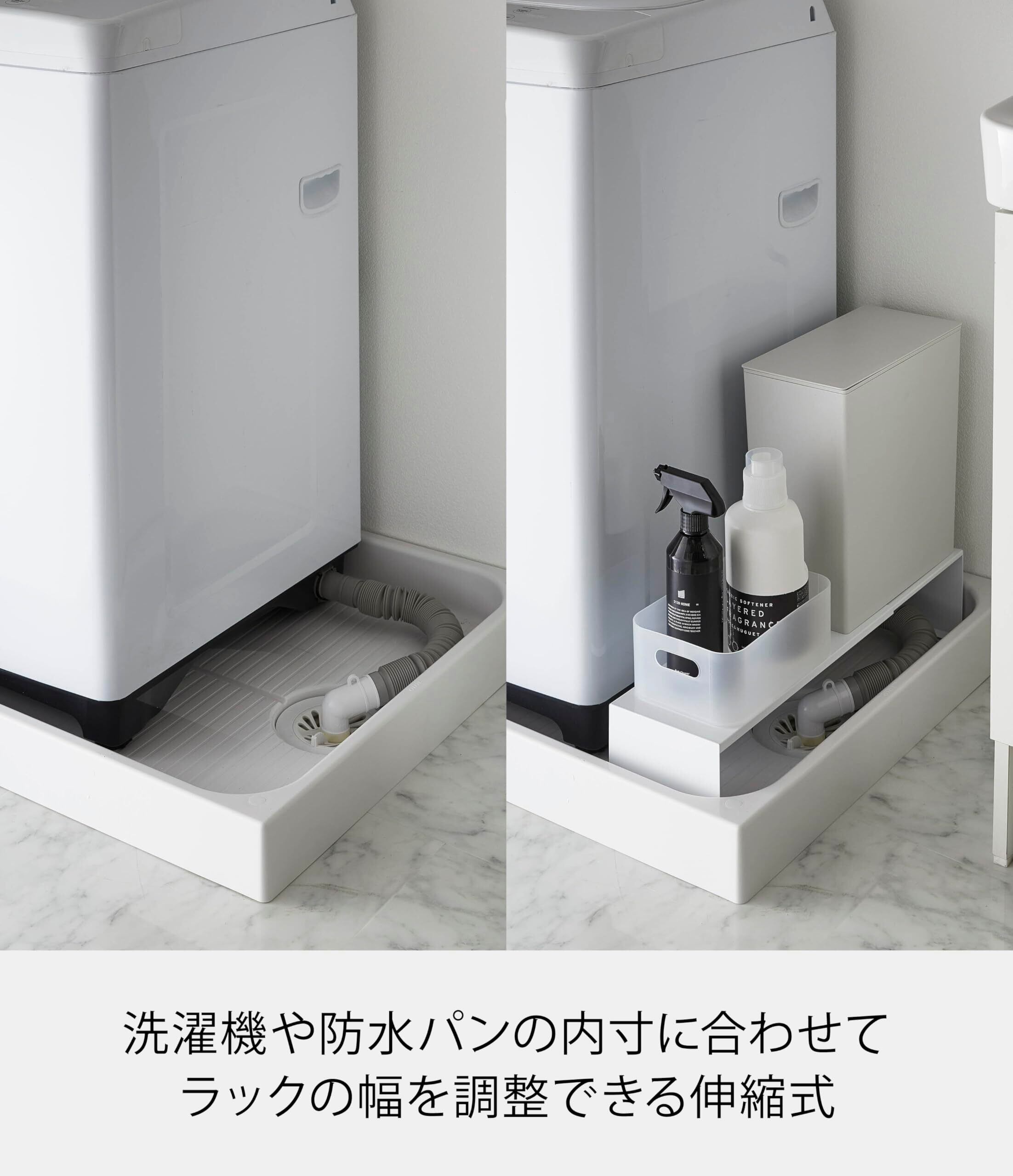 洗濯機の排水口とホースを隠しながら、その上を有効活用できる伸縮ラック。