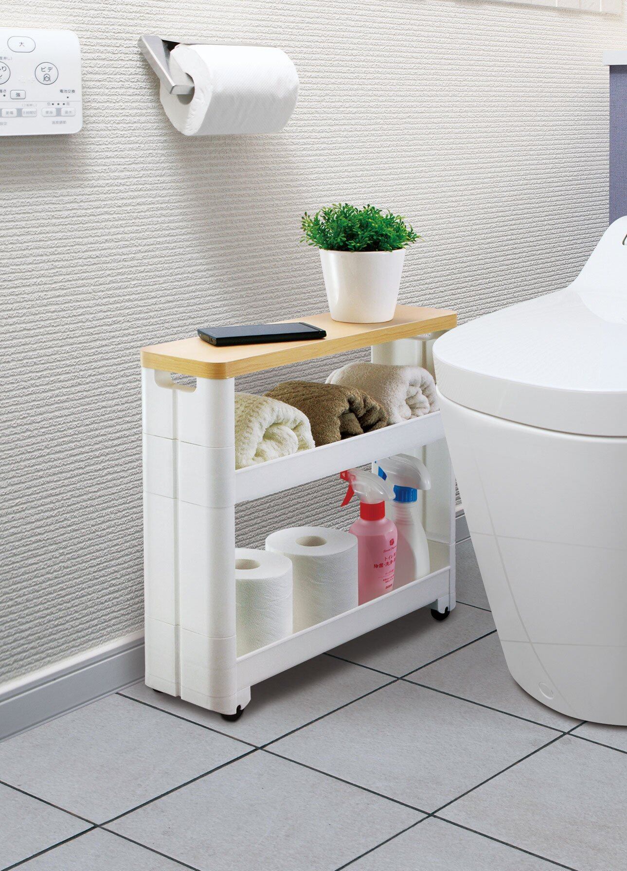 トイレットペーパーやお掃除用品の収納、ちょい置きにも便利。