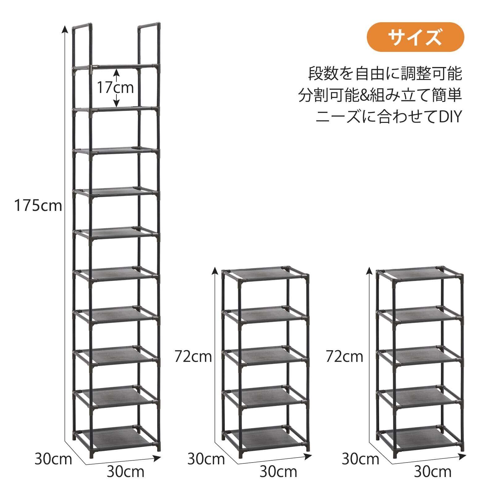【棚数を自由にアレンジ】お好みのように棚の数を自由に調整し、2つの靴収納ラックに分けて異なる部屋に配置するできます。一つの棚は取り外せて、ブーツなども収納可能です。お勧め:棚の数が多い場合、下から上まで重い靴を置いたら安定性がよりよいです。