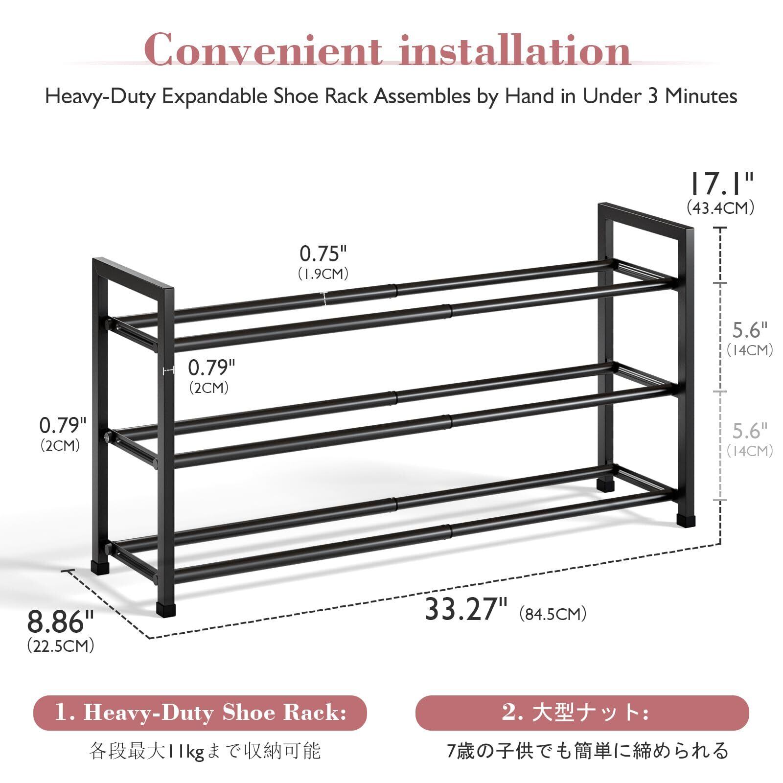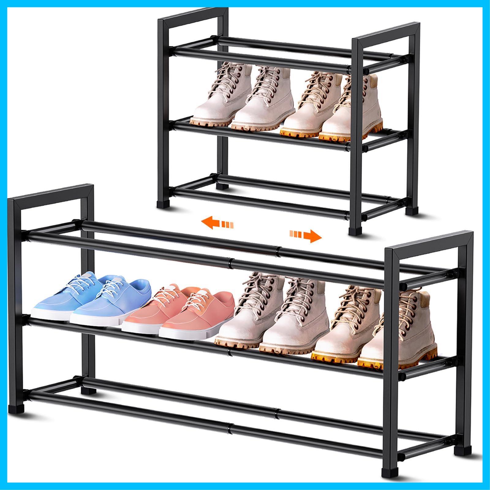 3段 伸縮式 シューズラック スリム 靴箱 スリム 省スペース 靴 収納 下駄箱 段ボールストッカー 玄関 廊下 鉄パイプ45cmから83cm伸縮 組み立て式(ブラック)