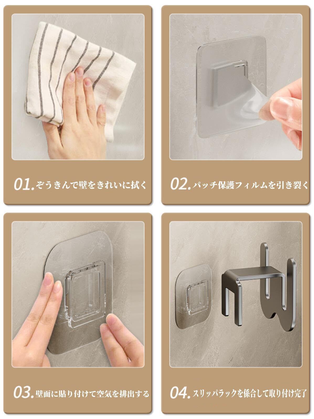 【多機能】必要なところに貼り付け、強力粘着タイプでガッチリ固定できます。手元に設置すれば、スリッパの取りや家事やすべて簡単になります。スリッパの収納はもちろん、浴室に取り付けてタオルを掛けてもいいです。とても便利です。玄関、廊下、リビングルームなど所でも設置できます。