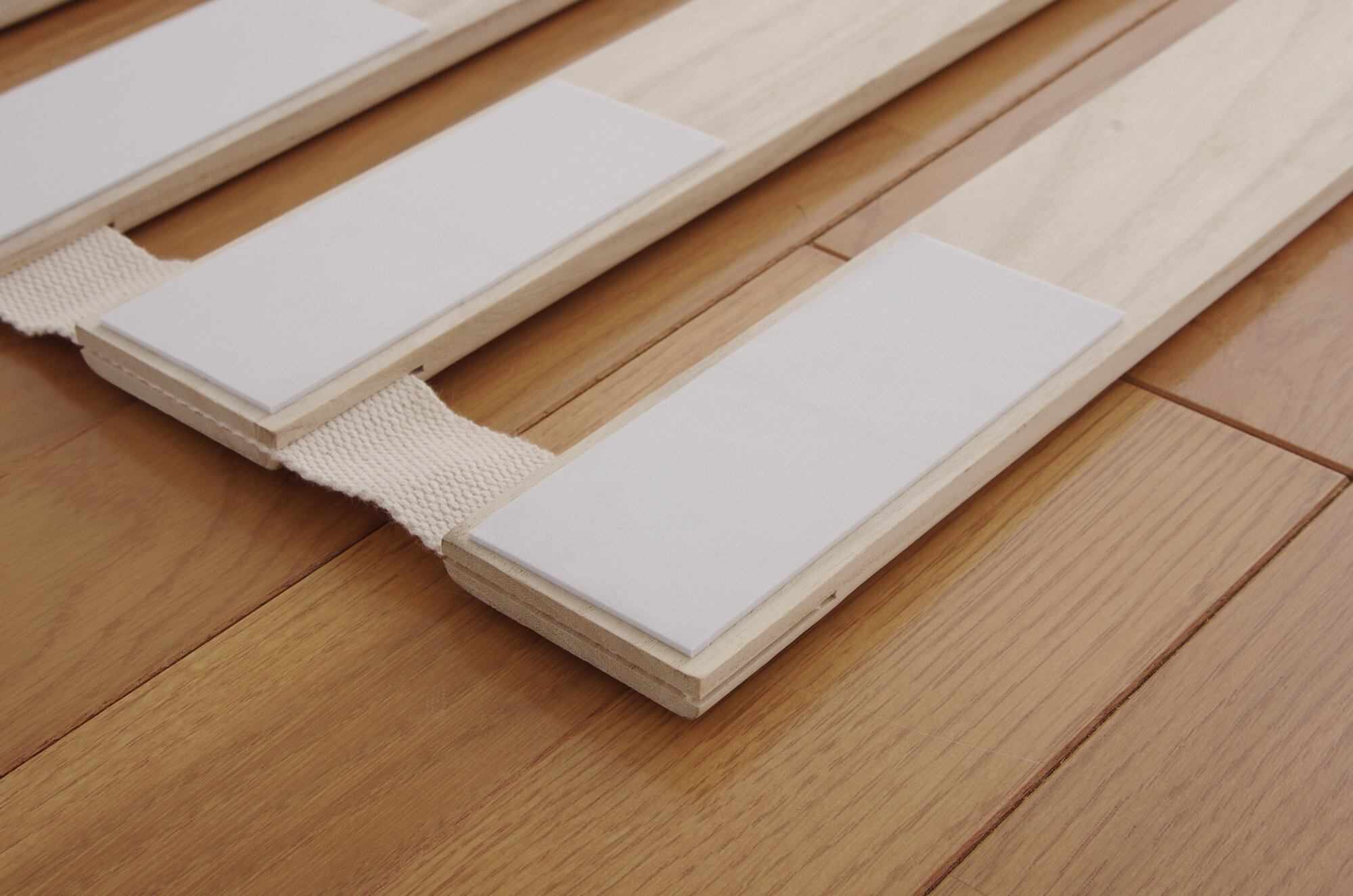 【傷を防止するクッション付き】底面にはクッションが付いているので、フローリングや畳を傷つけない。<br>すのこの角は面取り仕上げなので、布団などがひっかからず安心。
