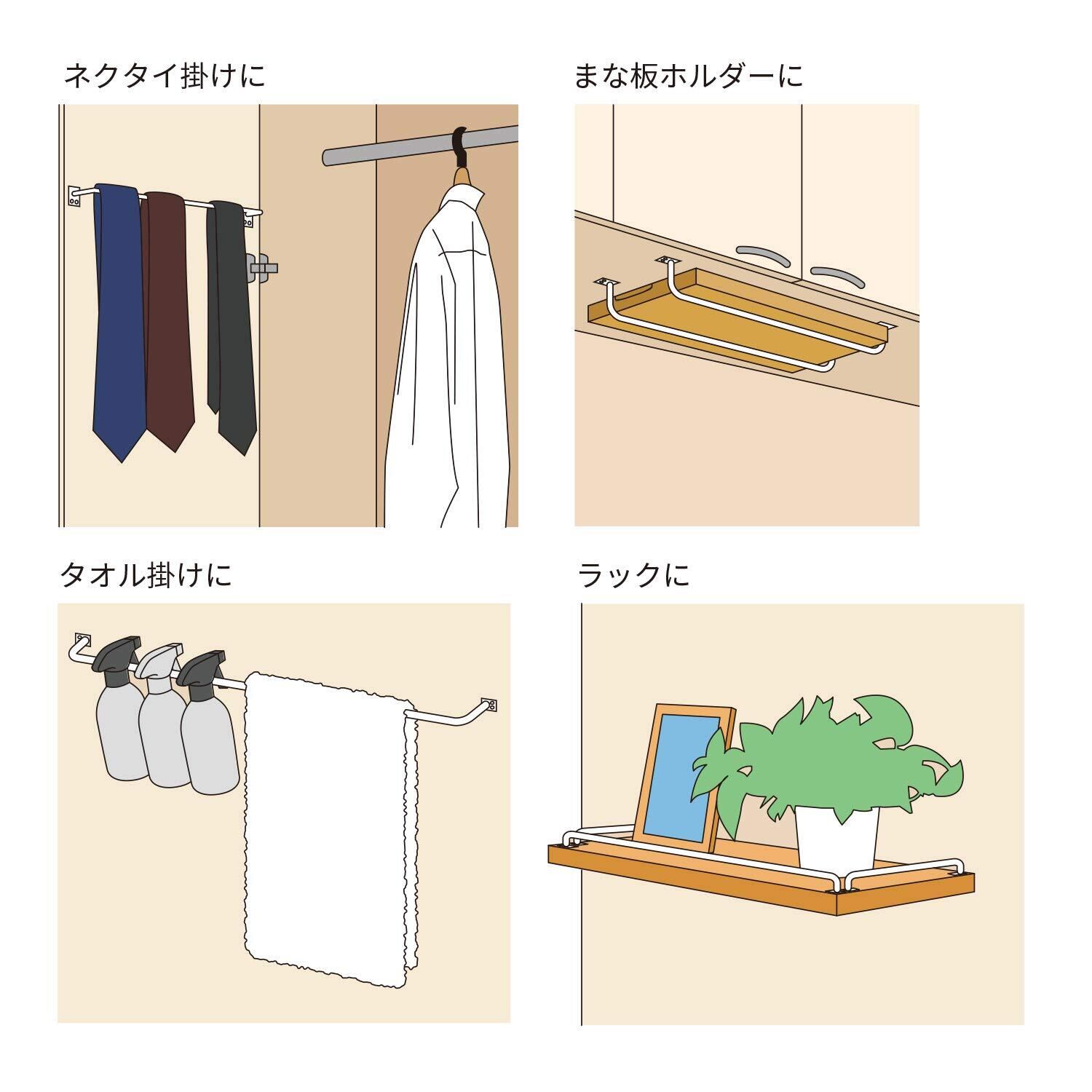 取付座の角度を自由に変えられ、様々な場所に取付可能。取付座が回転可能。用途に応じて取付位置を微調整できます。多用途に使えます。(取付ビス付属)使用例:マガジンラック、キッチン収納、シューズラック、バーカウンター、ネクタイ掛け、まな板ホルダー、タオル掛け、ラック等に。