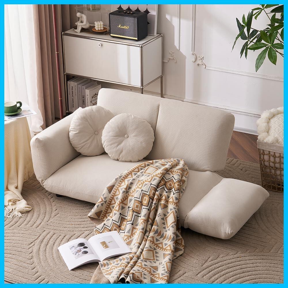 *「背面」6段階ギア リラックスする時の姿勢は人それぞれ。 このソファの背もたれは調節ができる6段階のリクライニングギアが付いているので、自分の好みの角度に細かく調節することができます。 *「肘掛け」6段階ギア 左右の肘掛は6段階のリクライニングが可能です。両側をフラットにしてベッドにしたり、片方だけを倒してちょっと休む際の枕にしたりと、気分に合わせた使い方ができます。 *解放感をもたらすロータイプ ソファの座高高は21cmと空間を広く見せてくれるロータイプになっています。 解放感をプラスしつつも、しっかりと座ることができる賢い設計はワンルームなどのお部屋にもおすすめです。 クッション折りたたみの状態では座椅子として。 ローテーブルと合わせてゆったりコーヒータイムなどに。 *カウチスタイル 座面を広げると座面に奥行きが出てロングサイズに。 足を伸ばしてゆったりくつろぎたい時に最適なカウチスタイル。 *フラットスタイル 背もたれのクッション部を広げ、背もたれを倒せばフラットスタイルに。 お昼寝やごろんとくつろぎたい時におすすめ。 *自在なリクライニング 背もたれは6段階リクライニング可能。 読書、お昼寝、来客時など、多彩なシチュエーションそれぞれに合った形に調節できる。 自分だけのお好みの角度調節で、オリジナルのくつろぎスペースを作れる。 *身体をやさしく包む肉厚クッション 座面と背もたれのクッション部分には、ウレタンフォームを採用。ふっくらとした仕上がりで底付き感がなく、体を優しく包み込むような座り心地。 またウレタンはわたのクッションに比べてへたりにくく、心地よさが長持ち。 *コンパクト梱包&簡易組立 梱包がコンパクトになり、玄関からの搬入がしやすい。 *二つクッション付き 付属の同色クッションは、腰に当てるのにちょうど良い、細長い形です。 枕にも使えますのでリラックスタイムにご利用ください。 *コンパクト収納 普段しまっておきたい人に嬉しいコンパクト収納。 お掃除の時やカビ対策に陰干ししたい時に立てておくこともできます。 *座面の厚みは約21cm。 たっぷりのクッション材が入っているので、ふわふわの座りごこちです。 *こだわりの三層構造 ボリュームのあるチップウレタン、ピュアウレタン、肌に近い上層のシリコンフィルの三層構造で底付き感のない快適な座り心地を実現しました。さらに、一番下にSバネを入れることで、しっかりと座面を支える構造になっています。 *セーフティーで安定感UP 背もたれを倒して使う際、背もたれには大きな圧力がかかります。これを支えるため、背もたれにしっかりとしたセーフティーを付けました。セーフティーが圧力を受け止めることで、ソファがバランスを崩して傾くのを防止します。