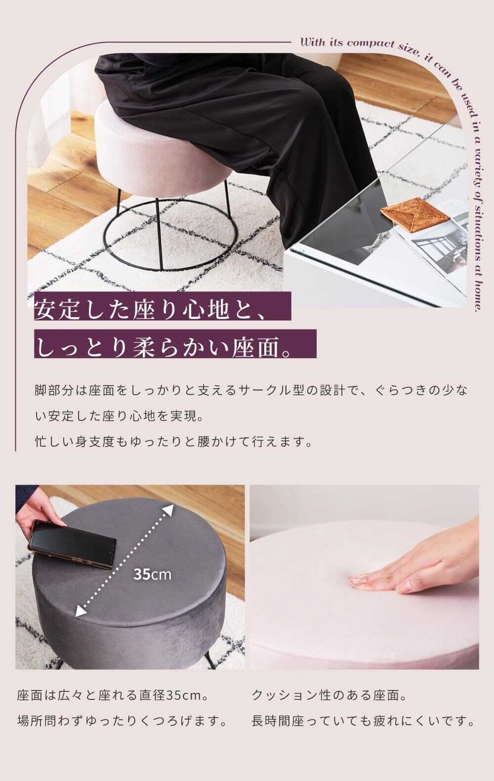 パレットライフ スツール 高さ35cm おしゃれ チェア チェアー 椅子 イス 背もたれなし 丸い 丸型 円形 スチール 脚 黒 ブラック ベロア アンティーク エレガント フェミニン おしゃれ かわいい シンプル グレー 玄関 リビング 完成品 組立不要 軽い 軽量 くすみカラー サイドテーブル