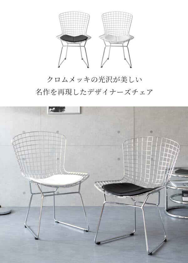 イームズやジョージ・ネルソンと並ぶ、ミッドセンチュリー期の代表的なデザイナー、ハリー・ベルトイアがデザインしたワイヤーチェアのリプロダクト品。 スチールのワイヤーが網目状に構成された背もたれは軽量かつ耐久性に優れております。広々とした座面はレザークッション付きでお尻が痛くなりにくく、くつろげるデザインです。 存在感のあるデザインでデスクやダイニングテーブルに合わせてスタイリッシュな空間を演出。座面のクッションはブラックとホワイトの2カラーからお好みでお選びいただけます。