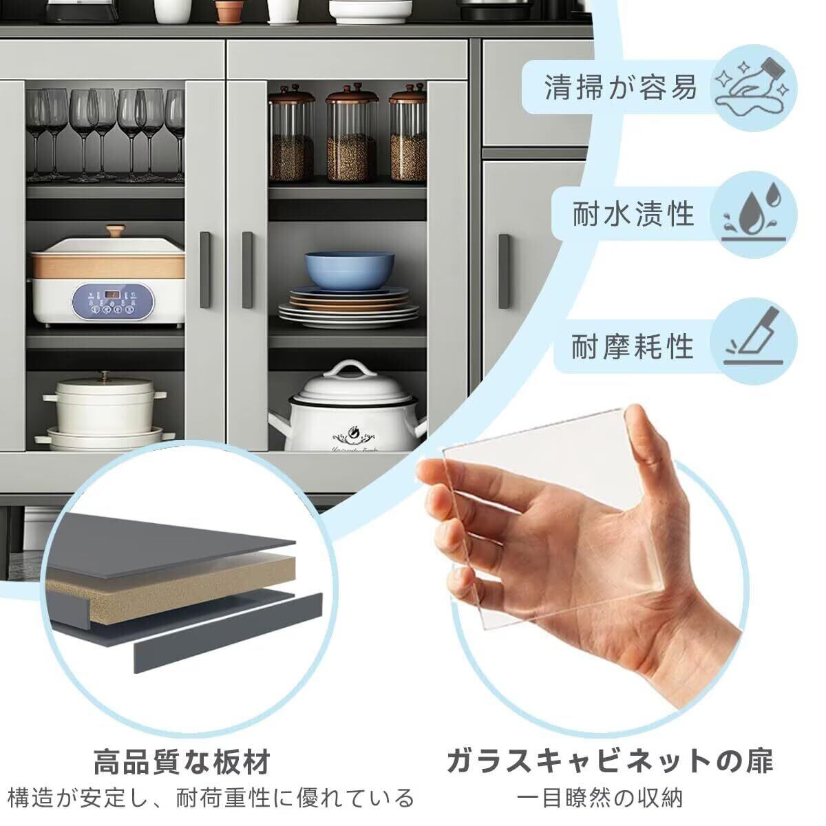 【防塵・防湿】キッチンラックのドアはガラス素材を採用しており、耐久性に優れ、開閉が便利です。密閉設計で防塵効果があり、ネズミやゴキブリなどの生き物対策も効いています。透けて中に収納したものが見えるので、探したい物をすぐに見つけます。