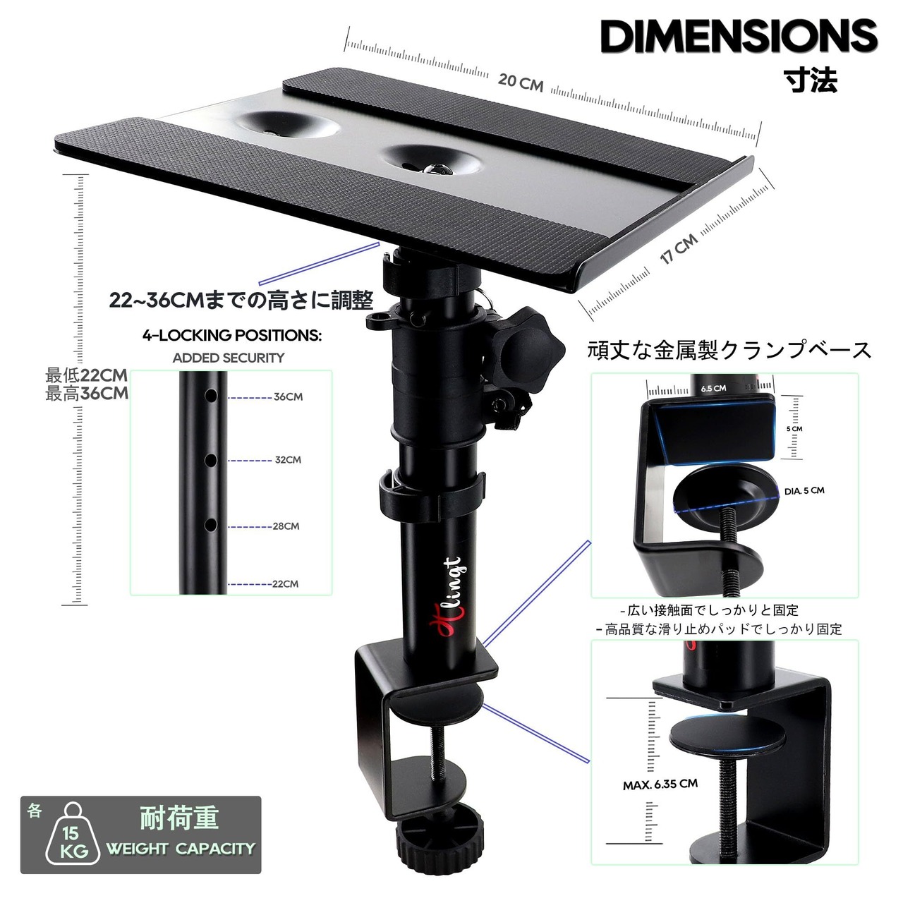 スピーカースタンド 卓上 クランプ モニタースピーカースタンド|小型天板17×20 cm|高さ調節22-36cm|角度調整±10°|耐荷重15kg|3~4インチのモニタースピーカー、ブックシェルフスピーカーに適しています スピーカー台 タイプで省スペース【2個セット】