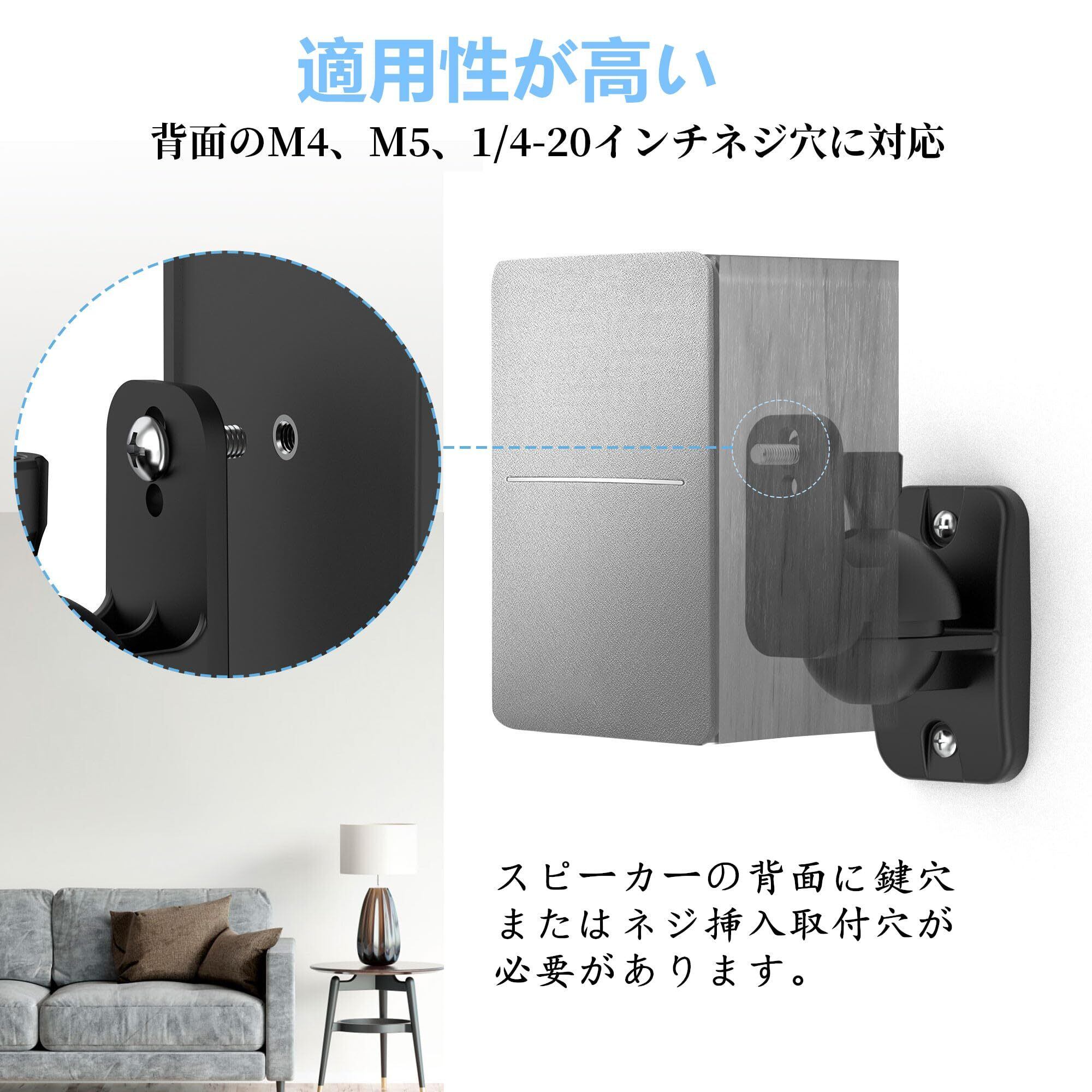 【2個1組】Cozycase スピーカースタンド「壁掛け/壁/小型/高さ調整/クランプ/金具/回転可能/万能壁掛け/おしゃれ」 ネジ付き 良い安定性 スピーカー ブラケット「天井/本棚/部屋/喫茶店/学校」などに適用 耐荷重3.5KG 黒「ブラック-2台」