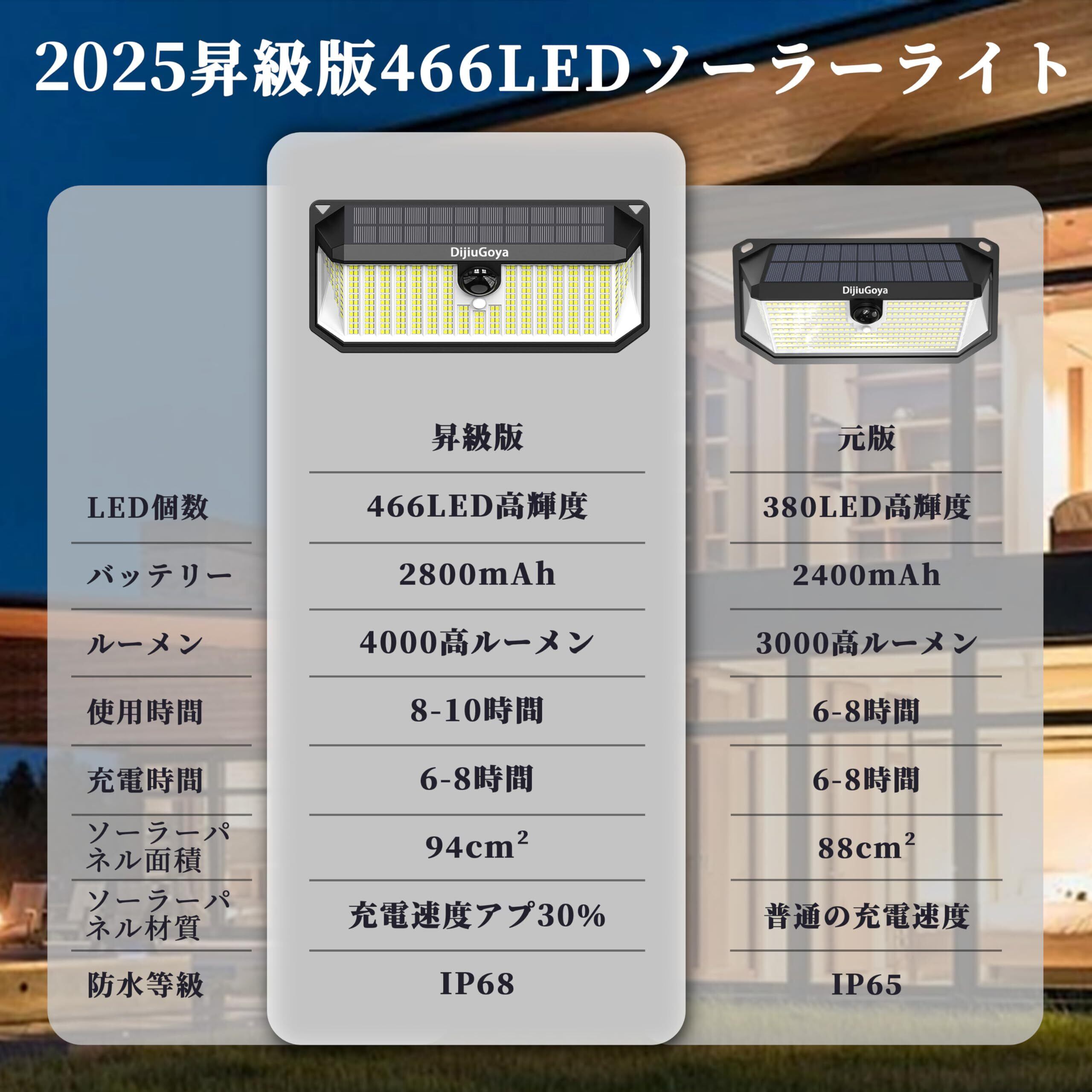 【最新昇級版】ソーラーライト センサー 屋外 466LED 4000ルーメン 強力 2800mAh大容量バッテリー ガーデン高感度人感センサー 太陽光発電 自動点灯 電気代不要 省エネ IP68防水防塵 ガーデン 明暗設置簡単 玄関/廊下/庭/壁掛け/駐車場/物置/停電時適用 ソーラー 防災ライト 地震 津波 台風 防災対応 クリスマスプレゼント