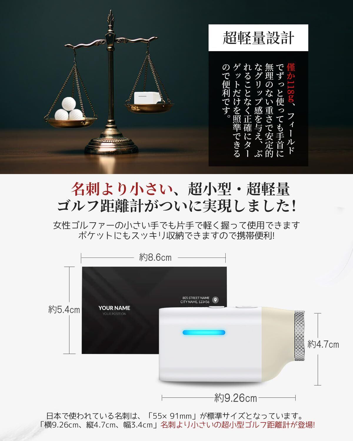 【超小型・超軽量】名刺より小さい、約9.26×3.4×4.7cm超小型コンバクトサイズの便利さをご体験ください。女性ゴルファーの小さい手でも片手で軽く握って使用できます。僅か118g、フィールドでずっと使っても手首に無理のない重さで安定的なグリップ感を与え、ぶれることなく正確にターゲットだけを照準できるので便利です。