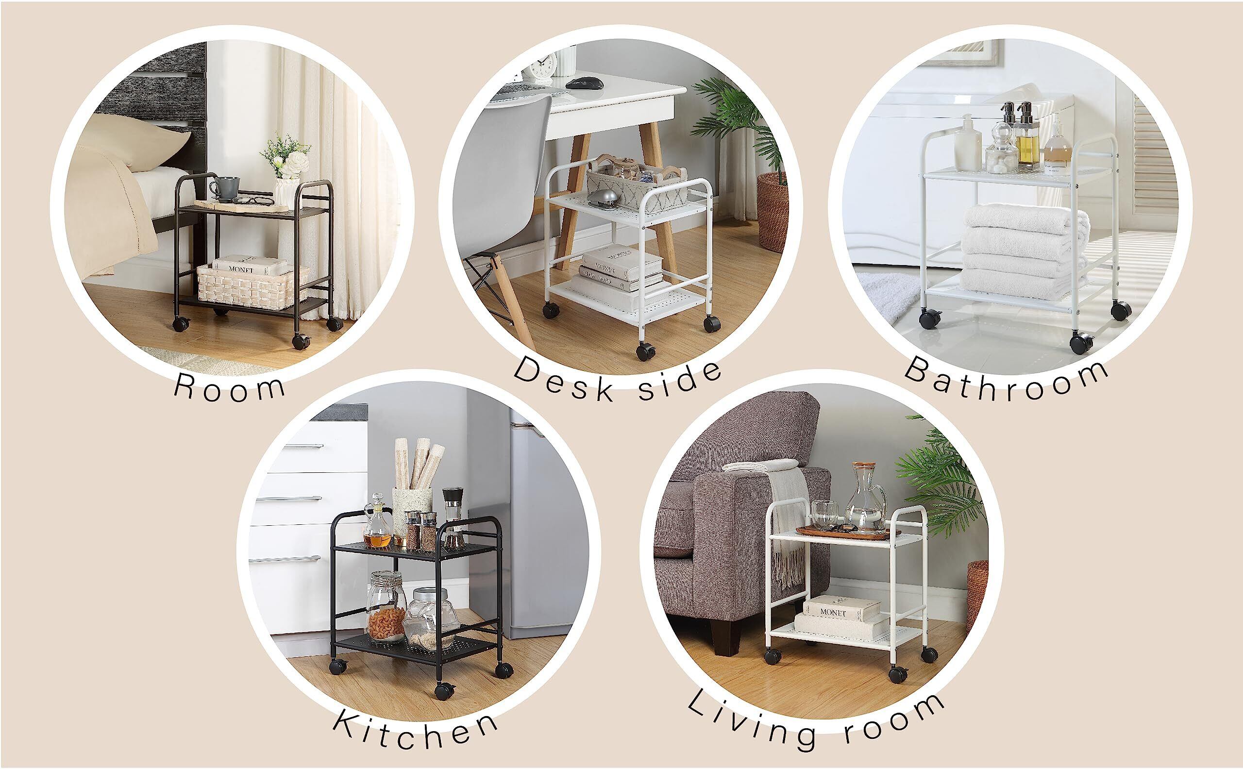 【移動・固定ラクラク】前2個キャスターにはストッパー付きで、ラックが固定し設置出来ます。ハンドルもあるので、移動がラクラクで様々な場所でも使いやすいです。また、床からラックの下段まで約5CM高さがあり、掃除が便利です。