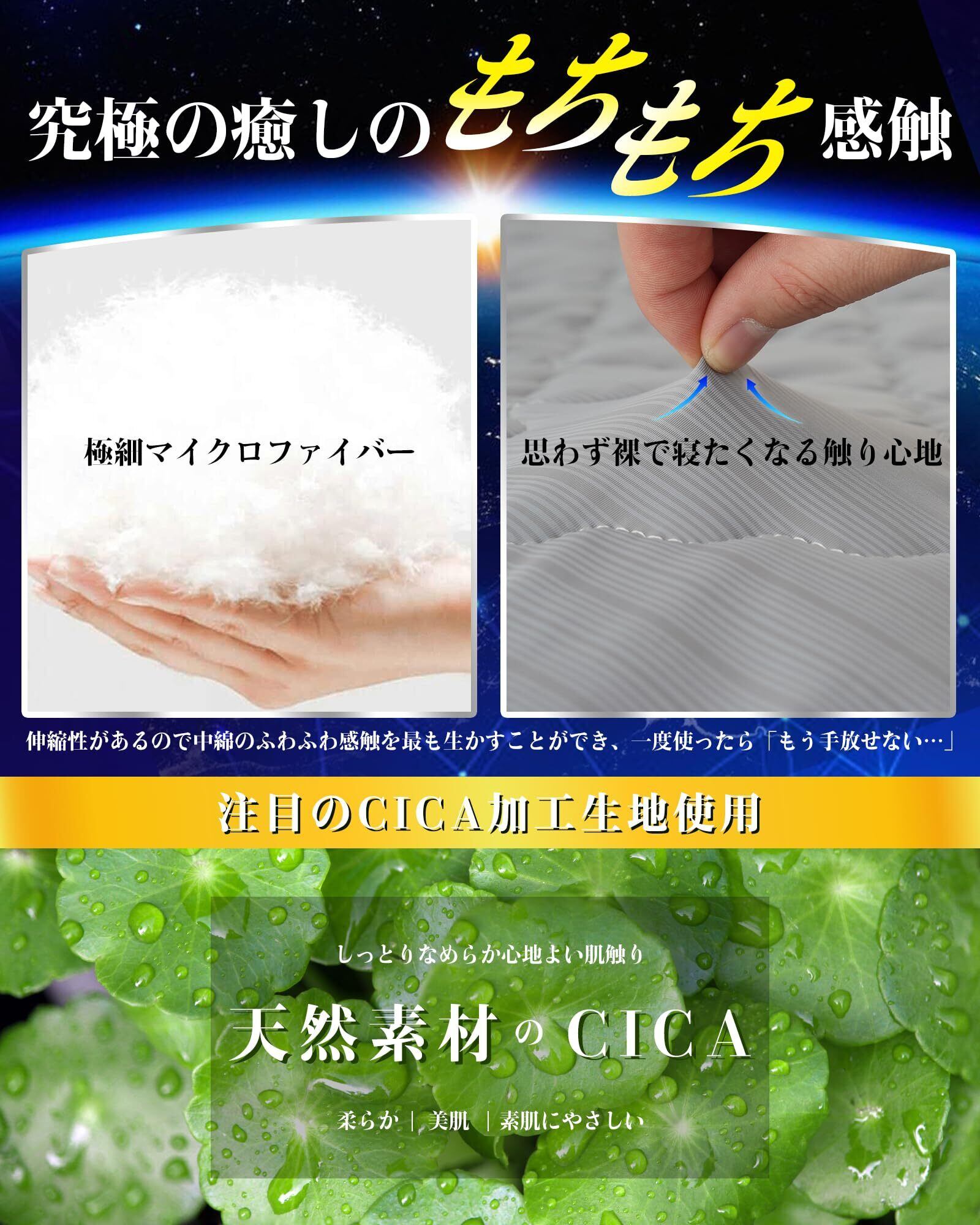 【極柔タッチ×CICA加工】究極の肌触りをを求め、一から糸と生地を開発。➡①弊社の研究者は研究に研究を重ね、特殊冷感ファイバーに極細のマイクロファイバー糸を加え、特殊な技法で交編し、こだわり抜いた極柔冷感敷パッドを開発しました!新感覚の「ひんやり涼しさ」と「とろとろ柔らかさ」を体感でき、一晩中快適な眠りを体験!➡②また、CICA加工で「天然由来の保湿成分」CICA(ツボクサエキス)を配合することで、保湿効果を高めています。しっとりなめらかできめの細かい肌ざわりが心地よい眠りへ誘い、お肌のケアと質の良い睡眠を同時にかなえることができます。