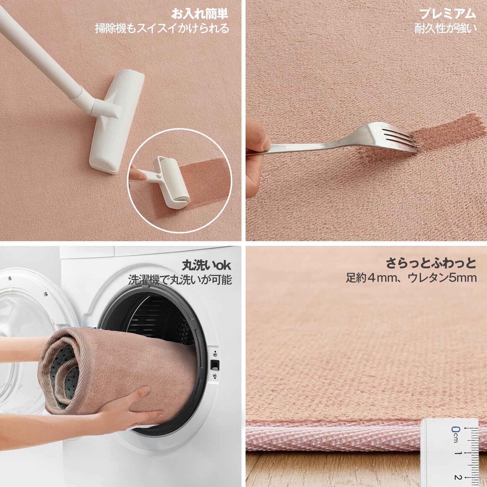 【家事がラク!】毛足4mmのショート設計で掃除も快適、毛糸にゴミが絡まらず、毛足が短く掃除がしやすい!ゴミが絡みにくく、掃除機やテープ(コロコロ)でもスイスイお掃除が可能です。遊び毛が少ないためホコリも出にくく、清潔にお使いいただけます。また、汚れてもご家庭で丸洗いができます。
