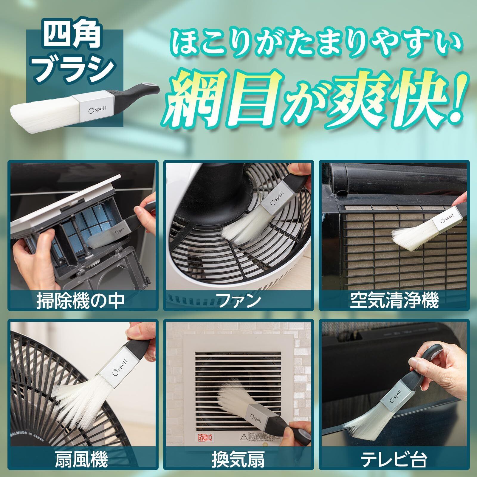 ●四角ブラシは網目におススメ!!毛の密度が高いのでファン 空気清浄機 掃除機の中 扇風機の羽 テレビ台 コピー機 ミニ換気扇のホコリ取りになど様々の隙間箇所にお使いいただけます。