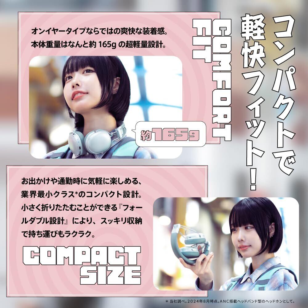 軽量設計で快適なフィット感:わずか約165gの超軽量設計で、業界最小クラス*のコンパクトサイズを実現。オンイヤータイプの快適なフィット感は、長時間の使用でも疲れにくく、ノイズキャンセリング機能を搭載しながらも、ストレスフリーな装着感を追求しています。フォータブル設計で折りたたみ可能、持ち運びもラクラクです。*当社調べ。2024年8月時点。ANC搭載ヘッドバンド型のヘッドホンとして。