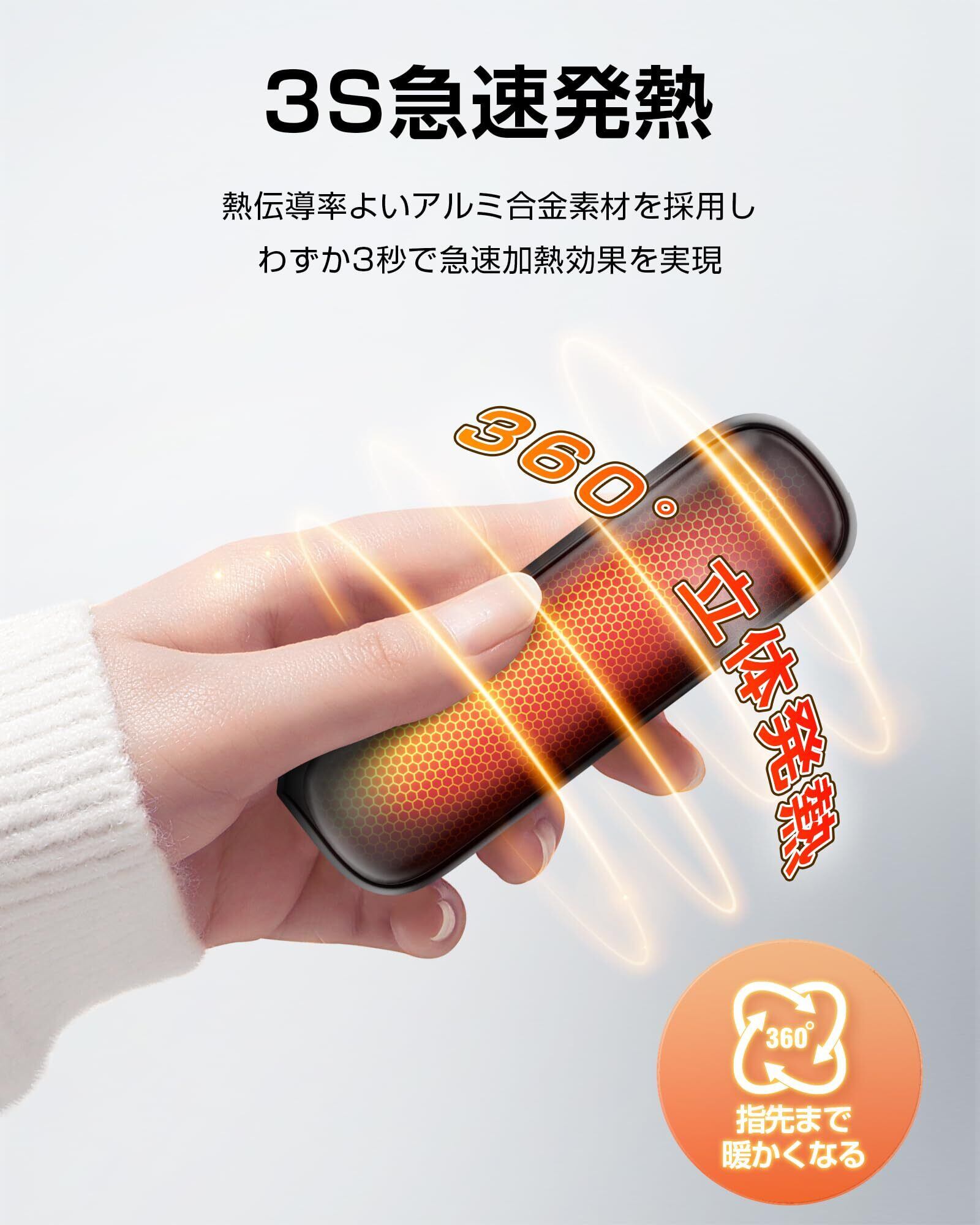 【3S急速発熱】HAGOOGI充電式カイロは、優れた熱伝導性を持つアルミニウム合金を採用しており、たった3秒で素早く発熱します。360度全方位から暖かさを提供し、指先から手のひらまで完全に包み込み、暖かい感触を楽しむことができます。